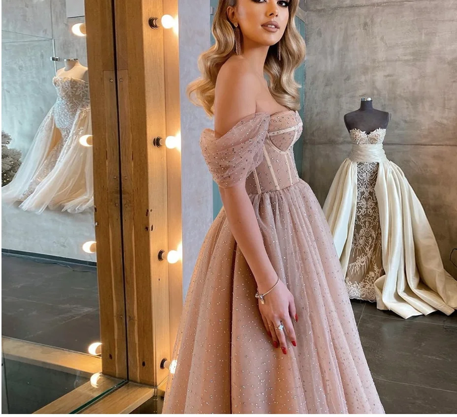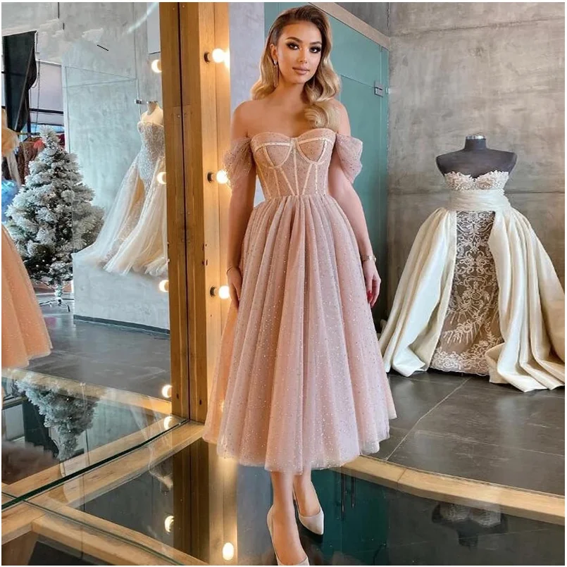 Розовые платья для выпускного вечера, трапециевидные тюлевые блестящие вечерние платья до середины икры с открытыми плечами и кристаллами, индивидуальный пошив, 2022
