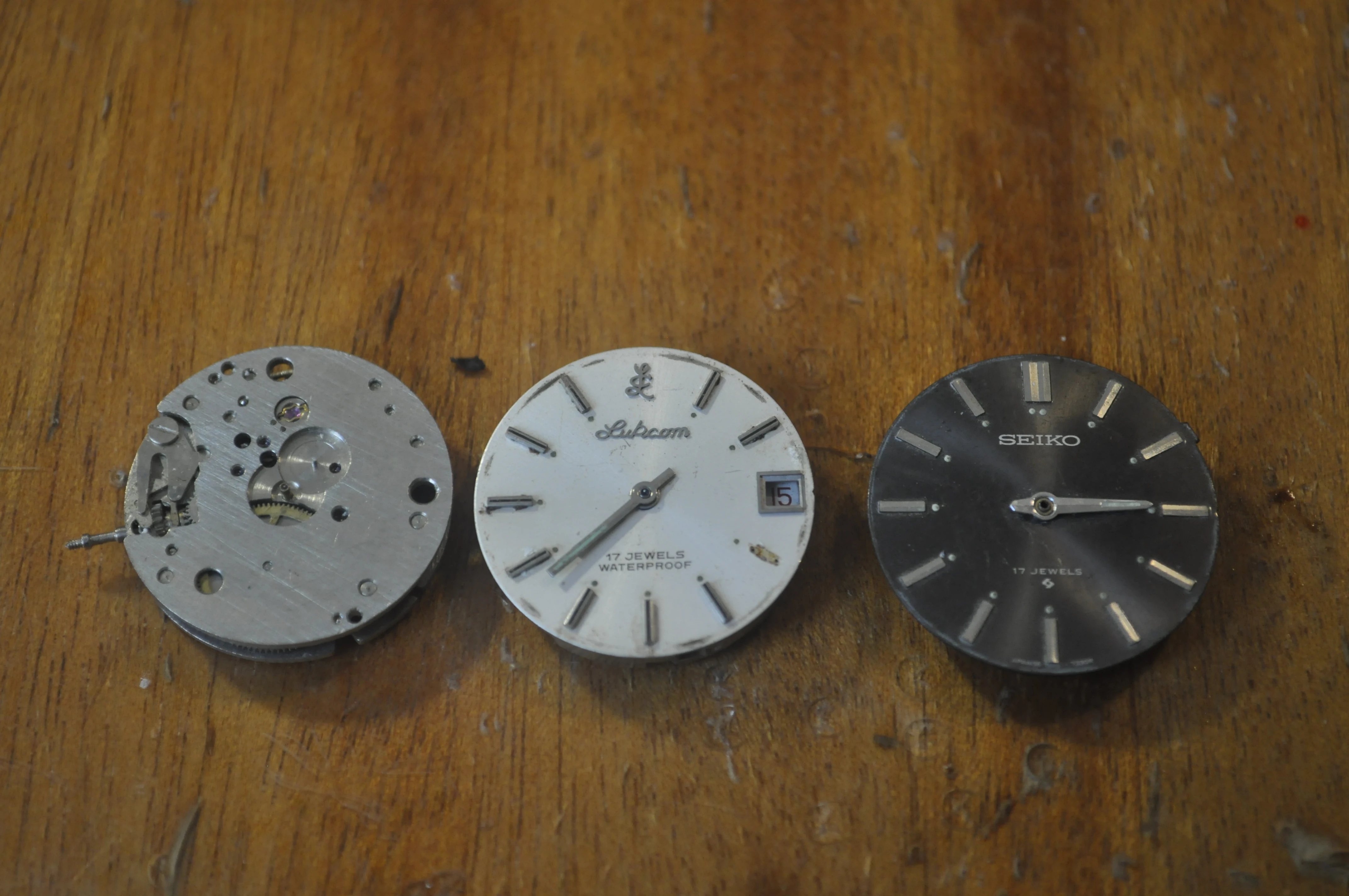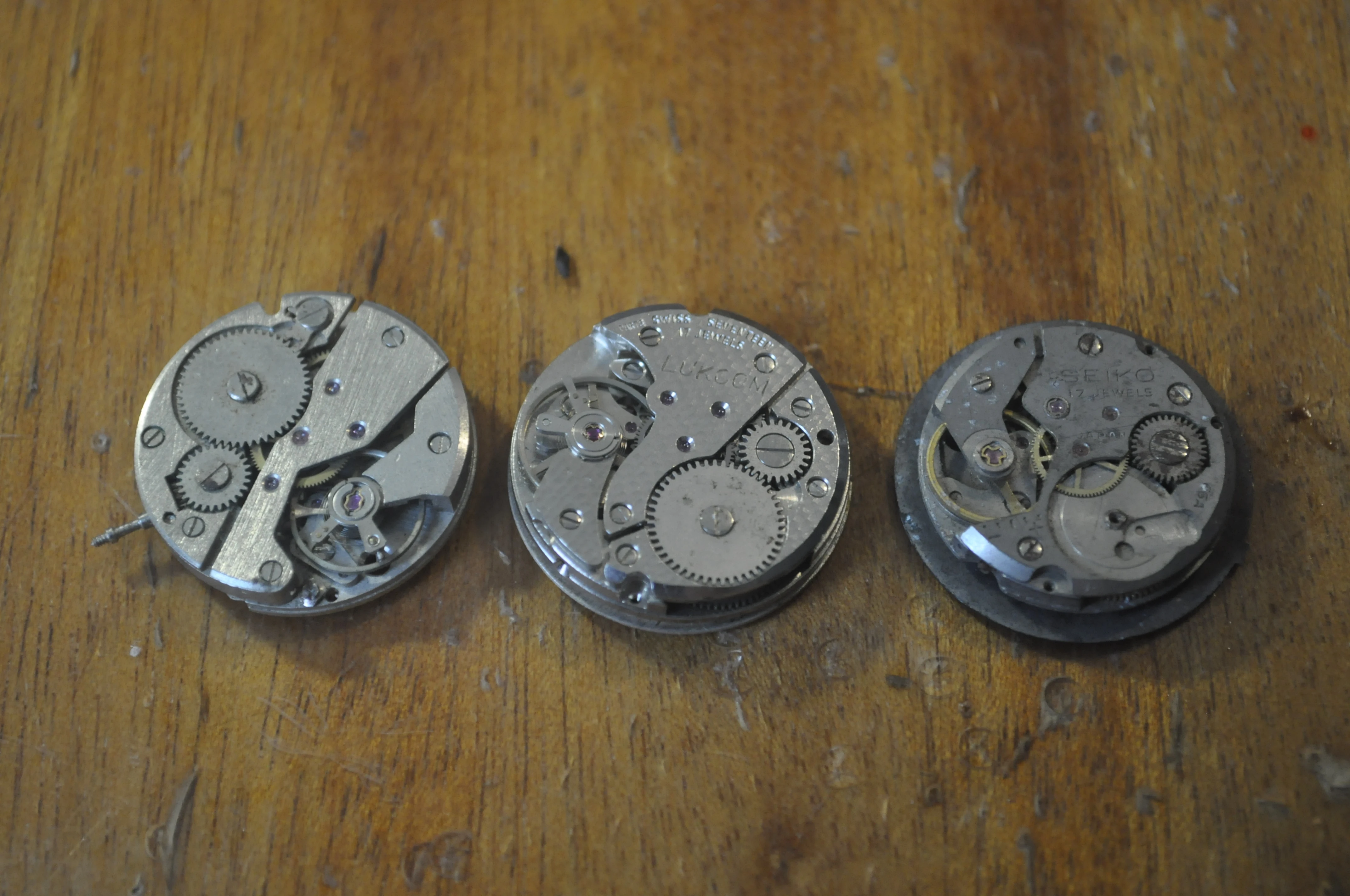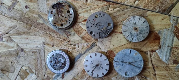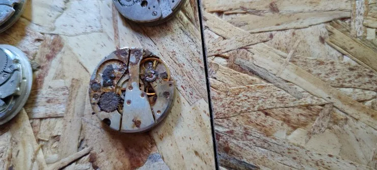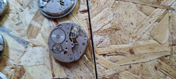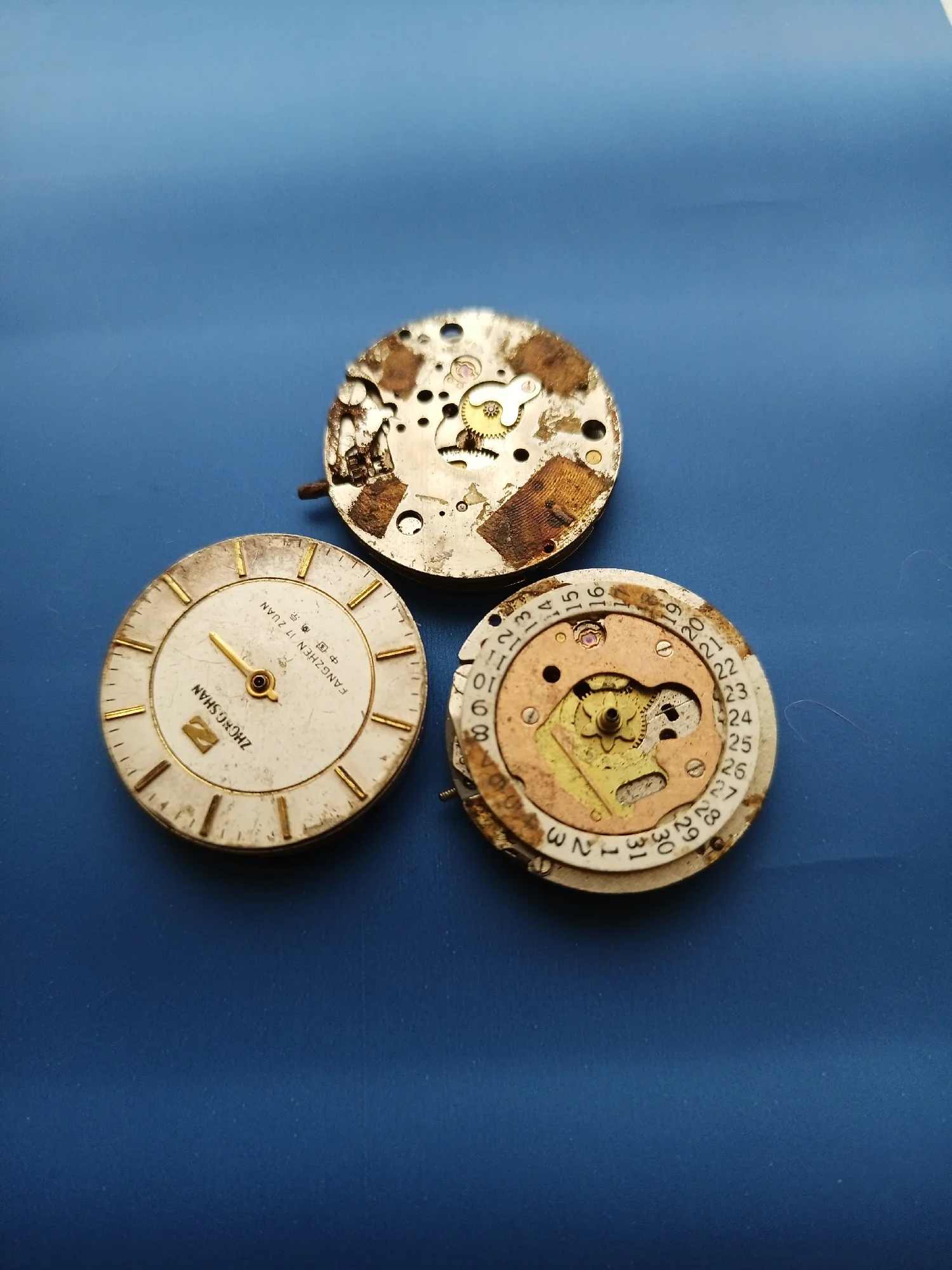 Вот такие механизмы пришли. Два с ржавчинкой, а третий (посередине на фото) без коррозии и даже узел баланса вроде как цел. Не думаю, что какой-то из них можно восстановить, но использовать на запчасти или потренироваться в сборке-разборке и выправлении волоска баланса - вполне можно. Удивило ещё то, что, несмотря на упаковку (просто почтовый пакет), всё доехало относительно целым.