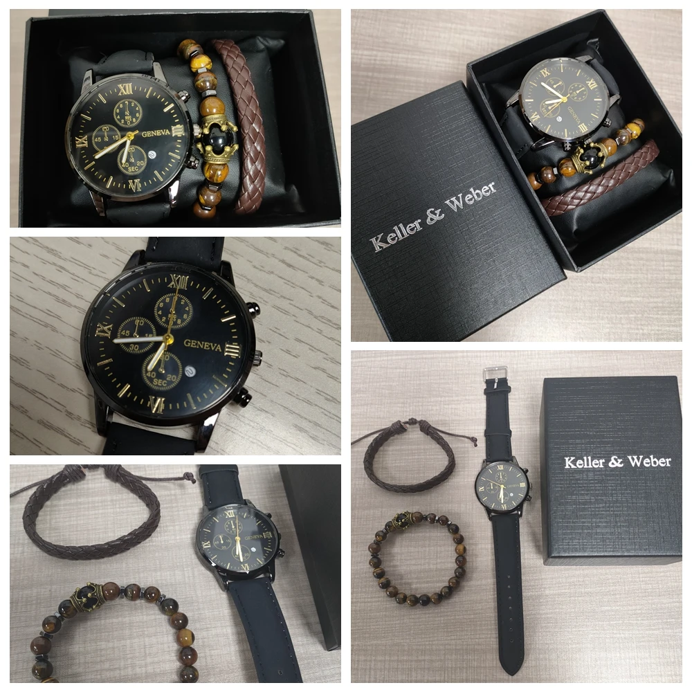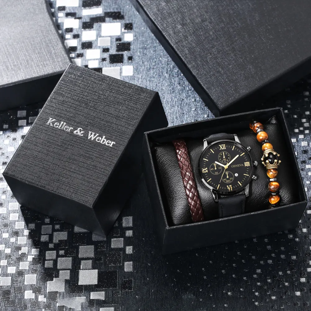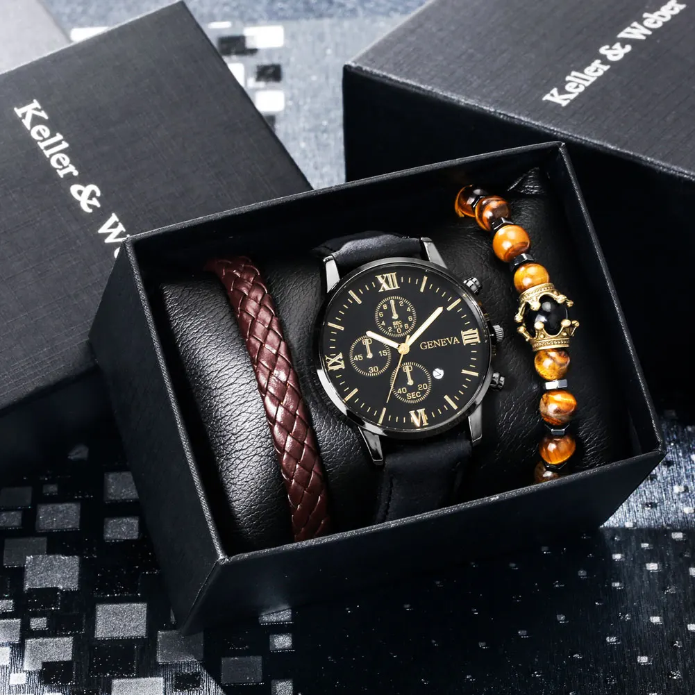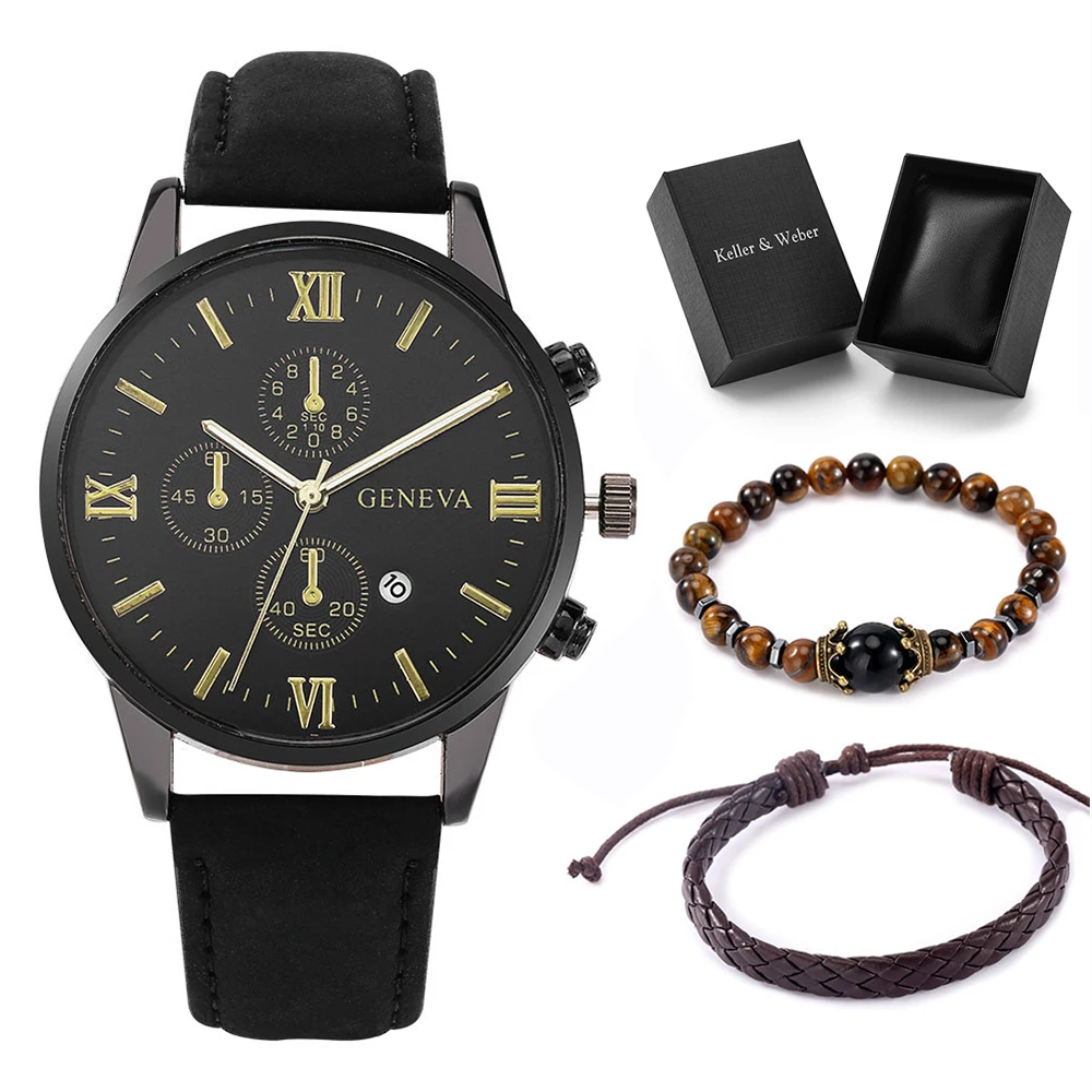 Набор мужских часов и браслетов, мужские черные кварцевые часы, пле...