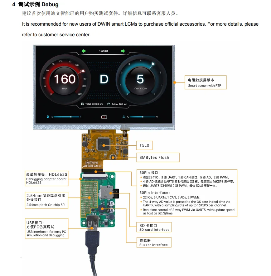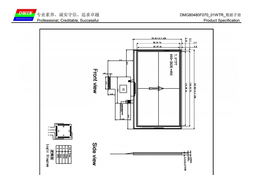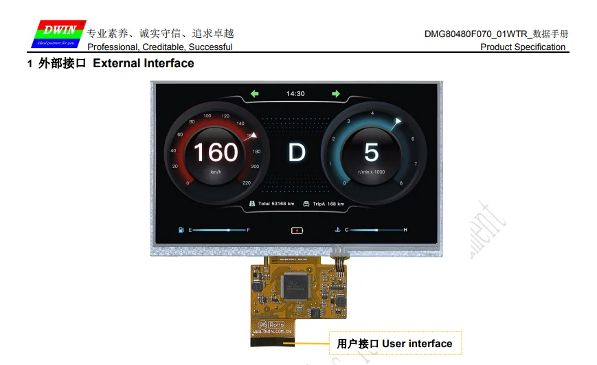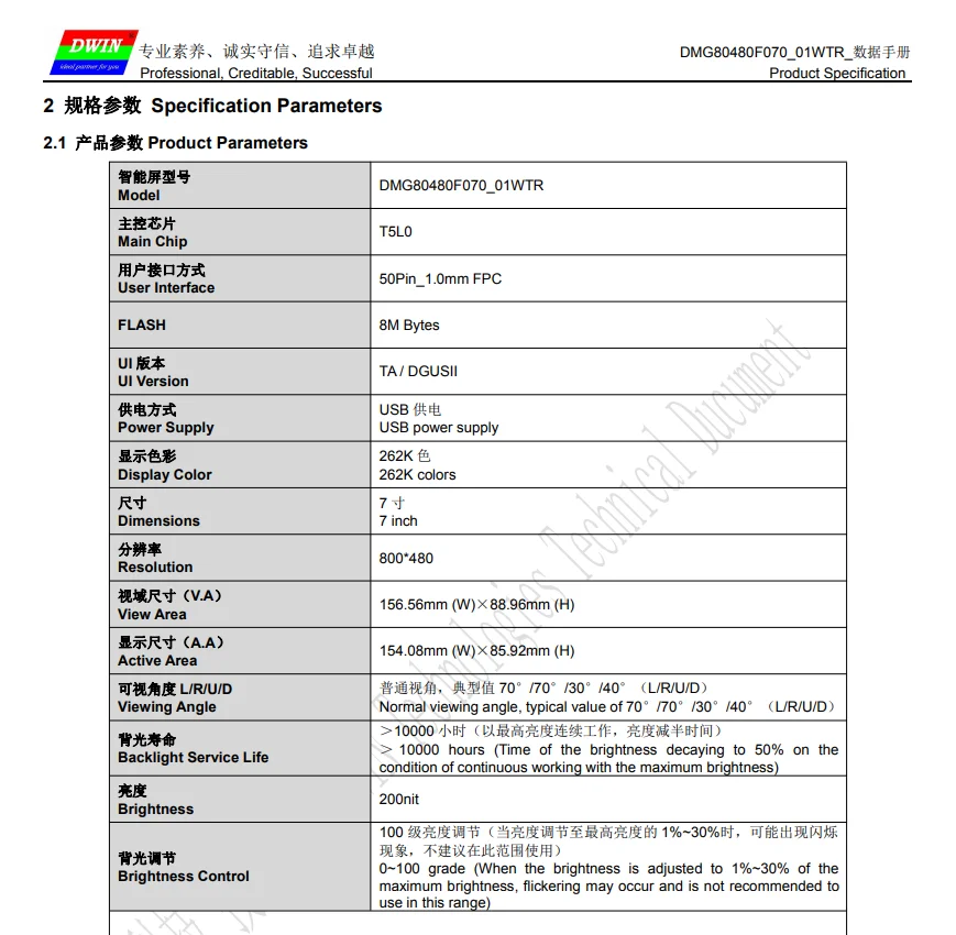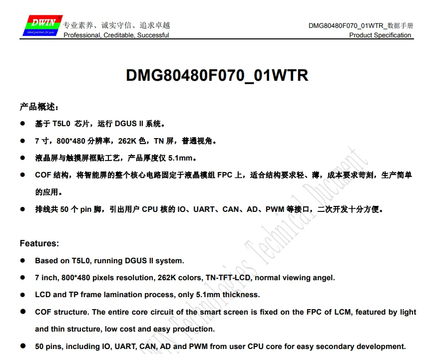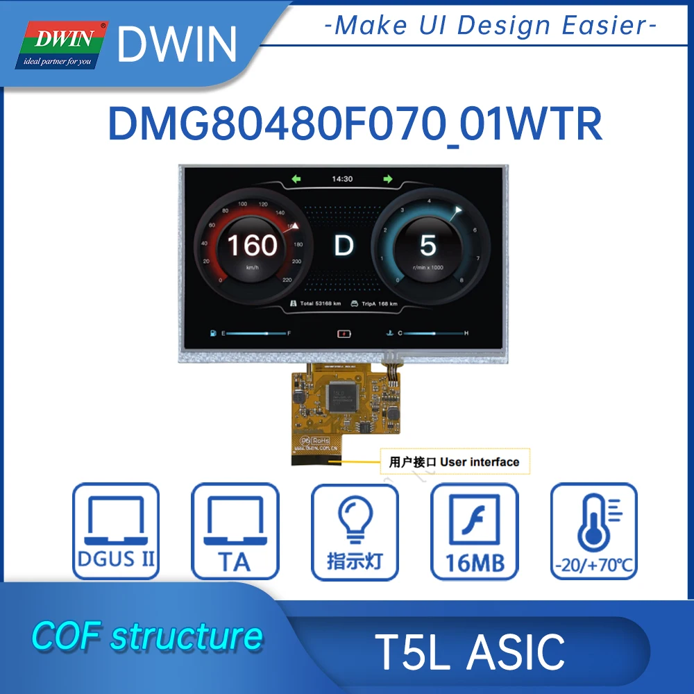 DWIN 7 дюймов, разрешение 800*480, 262K цвета, TN-TFT-LCD, COF структура, резистивный сенсорный экран, UART, DMG80480F070_01WTR