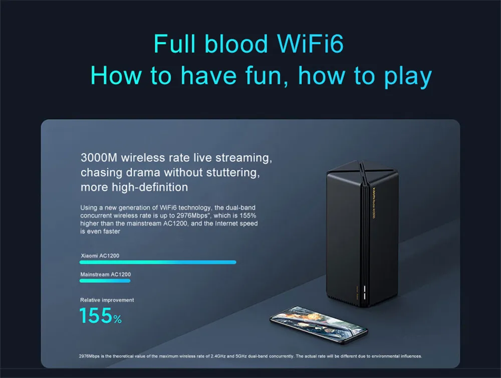 Используя технологию Wi-Fi 6 нового поколения, Двухдиапазонная Беспроводная скорость составляет до 2976 Мбит/с, что на 155% выше, чем основной AC1200, а скорость Интернета еще быстрее.