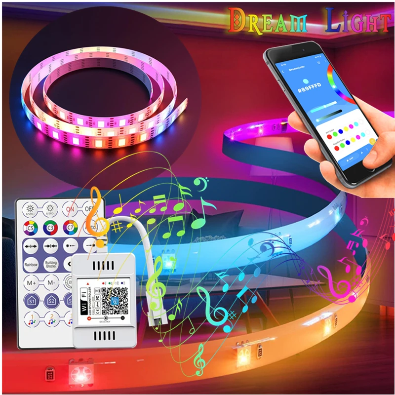 Особенности светильник мечты:1. Поддержка Bluetooth APP управления и инфракрасного дистанционного управления.2. Встроенный микрофон с музыкой и немузыкальными эффектами, мульти-Параметр регулируется.3. Функция автоматического сохранения заданных параметров.Светильник Длина ленты: 5 м/10 м/15 м/20 мМетод контроллера:1. 38-клавишная инфракрасный дистанционный пульт (без батареек).2. Bluetooth Smart APP.3. Умный WiFi контроллерАдаптер питания: источник питания DC12V.Водонепроницаемость: IP65 водонепроницаемый/IP20 не водонепроницаемый.● Светодиодный светильник DreamColor бар: наш светодиодный светильник для музыки использует Улучшенный чип IC, который может быть красочным, как радуга сразу, с эффектами чеканки, прыжков и мигания. Более необычный и яркий, чем светодиодный RGB освещение.● Множество режимов изменения цвета: он поставляется с 18 режимами изменения цвета музыки и 142 режимами изменения цвета без музыки, которые являются яркими и красивыми. Он может автоматически изменить цвет или изменить цвет в соответствии с вашей командой в режиме non-music.● Статические цвета и яркость регулируются: если вы не хотите, чтобы музыкальный режим, настройте его на статический цвет, используемый для настройки освещения, например, белый, красный, зеленый, синий, И т. д. Яркость любого цвета можно регулировать.● Несколько приложений:1. Может использоваться для украшения автомобилей и велосипедов, рамы или контурного освещения.2. Широко используется для улучшения дома, гостиниц, клубов, торговых центров.3. Архитектурное декоративное освещение, изысканное освещение настроения.4. Широко используется для подсветки, скрытого освещения и освещения слотов.5. Аварийное и безопасное освещение, рекламный знак освещения.6. Декоративное освещение для фестивалей, мероприятий и выставок.
