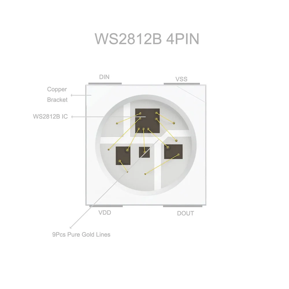 Протокол передачи данных использует один режим связи NZR. После сброса питания пикселя порт DIN получает данные от контроллера, первый пиксель собирает исходные данные 24 бит, затем отправляется во внутреннюю защелку данных, другие данные, которые изменяются с помощью внутренней схемы усиления сигнала, отправляются на следующий пиксельный каскад через порт DO. После передачи для каждого пикселя? Сигнал для уменьшения 24 бит. Pixel принимает технологию автоматической передачи resha-ping, что делает количество пикселя каскадом не ограничено передачей сигнала, зависит только от скорости передачи сигнала.