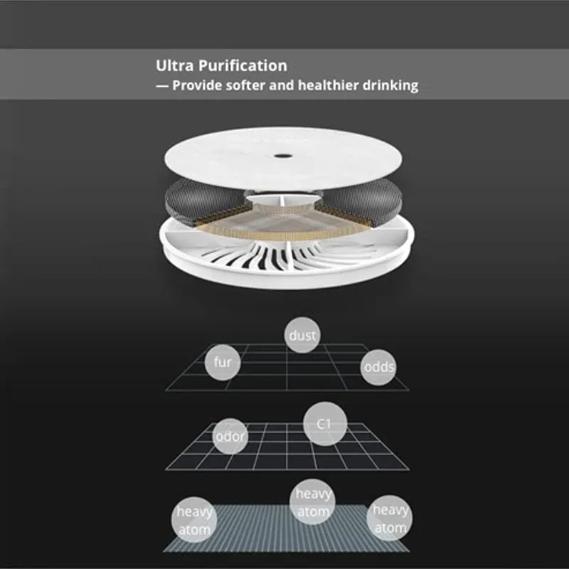 1 .. хлопковый фильтр 2 раза фильтрация для удаления мелких частиц и тонких волос 2. Фильтр с активированным углем Глубина фильтрации, Удаление хлора и микроорганизмов, Улучшение вкуса 3. Смола для замены Смягчает качество воды и удаляет ионы кальция и магния, которые вызывают камни мочи домашних животных