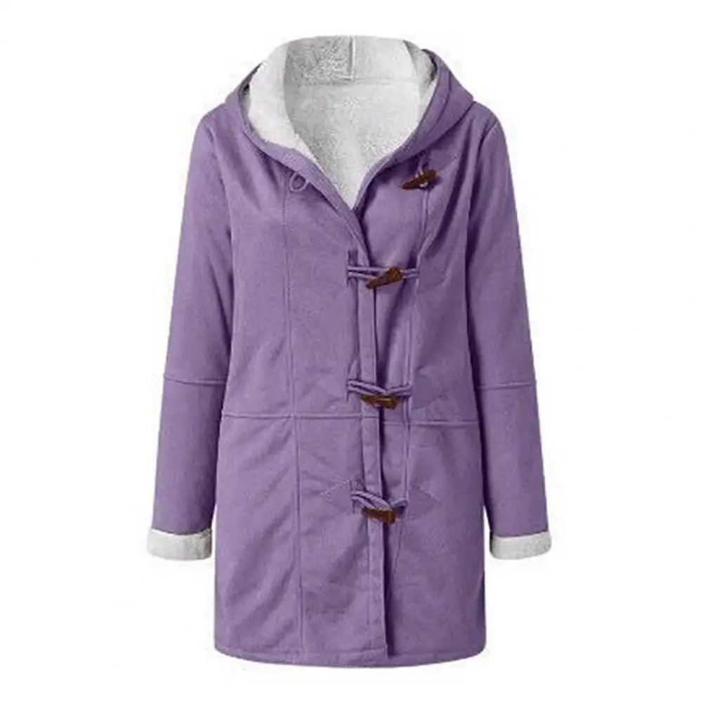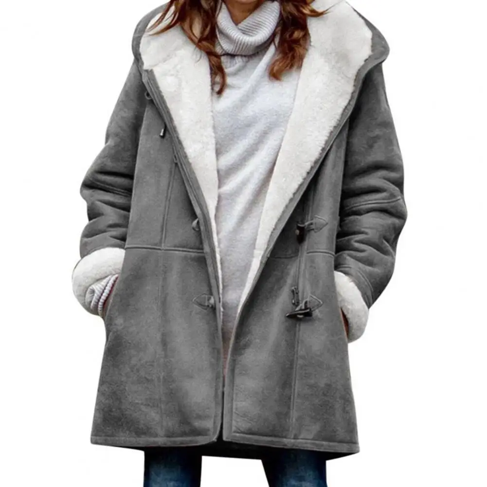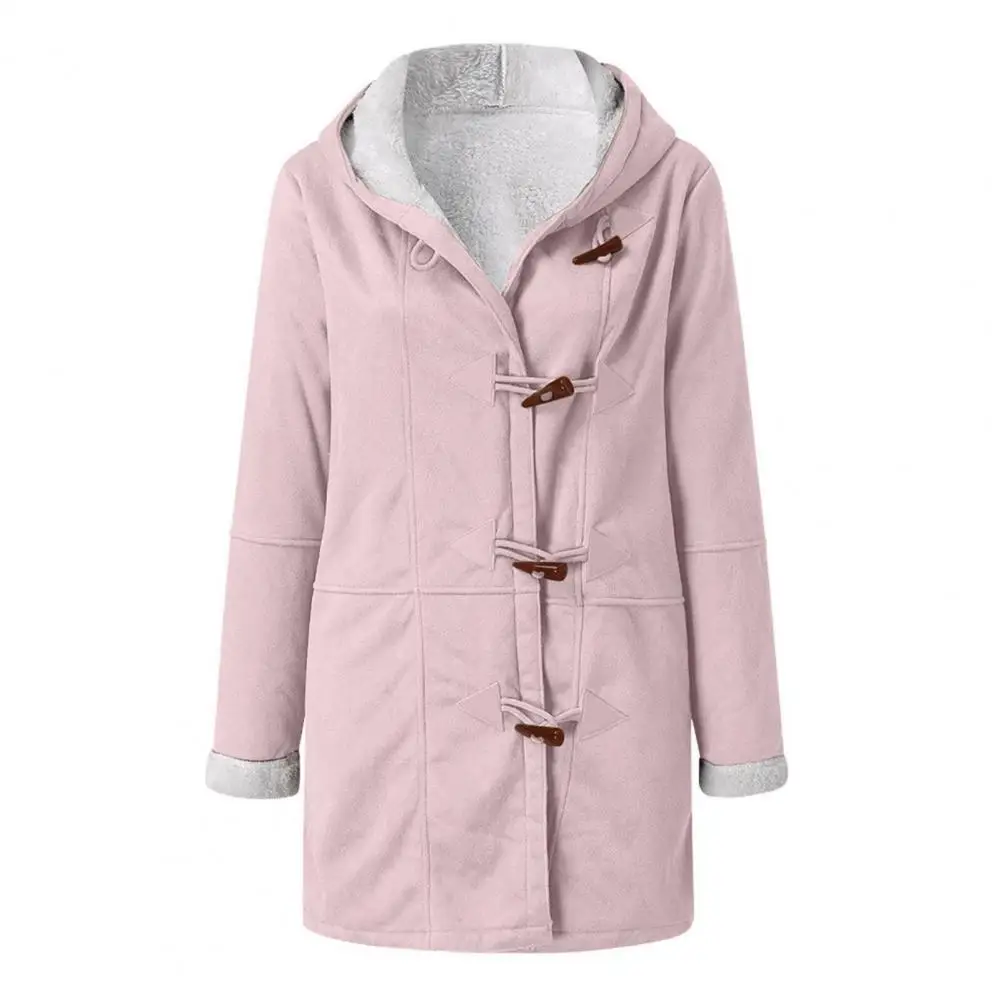 Прямая поставка! Куртка женская зимняя однотонная с флисовой подкладкой, пальто с карманами и пряжкой из коровьего рога, верхняя одежда с капюшоном