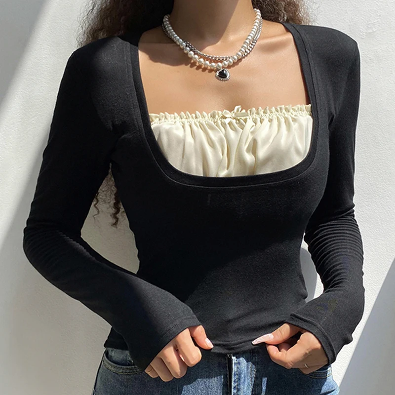Женский топ с квадратным вырезом, черная футболка с длинным рукавом и оборками в готическом стиле, Y2k