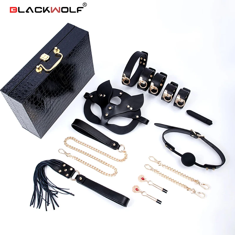 BLACKWOLF БДСМ Связывание наборы из натуральной кожи удерживающий набор наручники Ошейник Кляп Вибраторы интимные игрушки для женщин пары взрослые игры