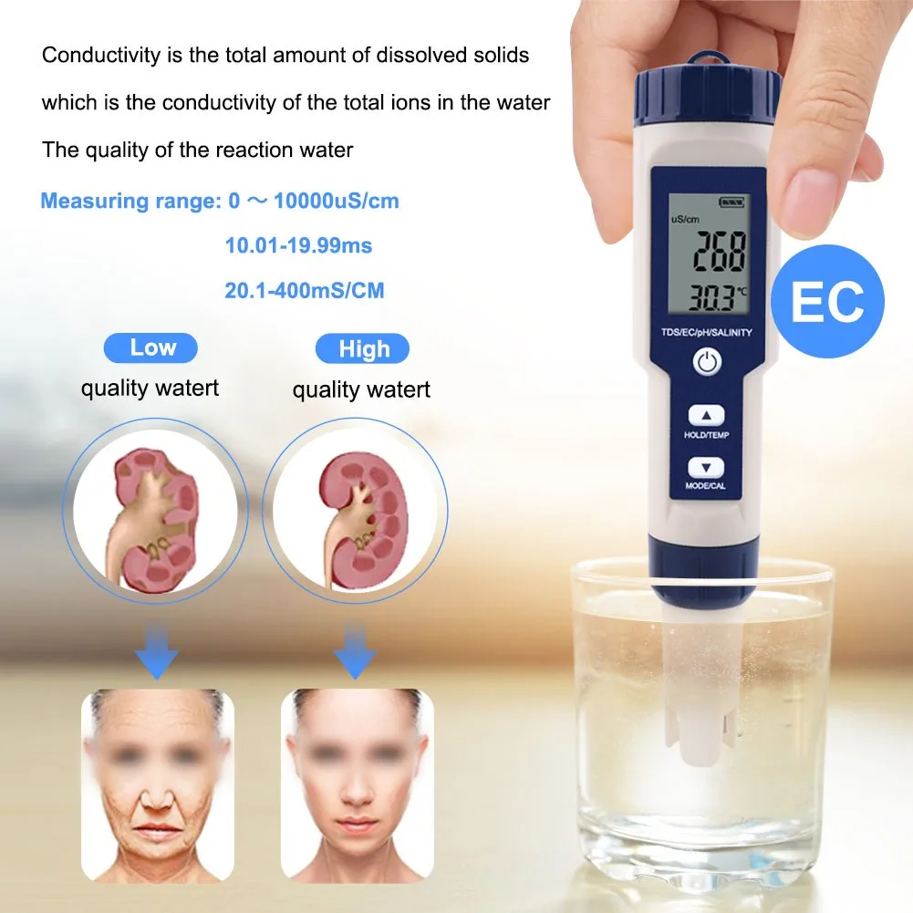 Цифровой тестер качества воды 5 в 1, измеритель температуры и солености рН с ЖК дисплеем и подсветкой, водонепроницаемый многопараметрический детектор