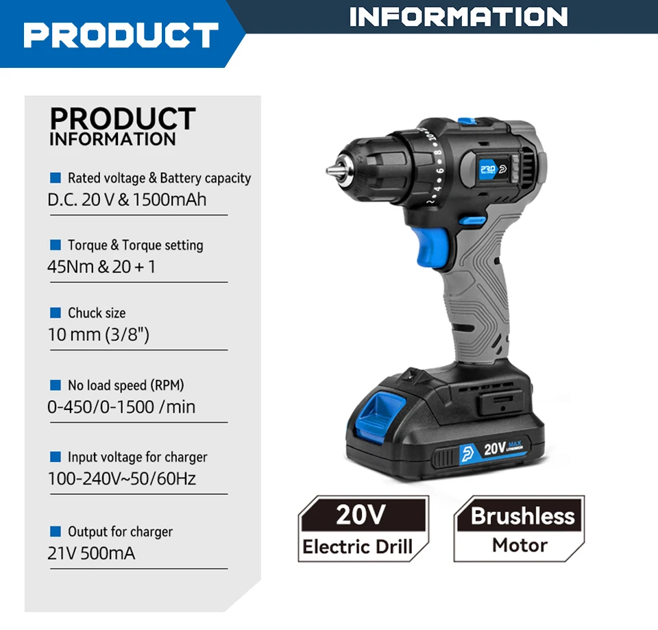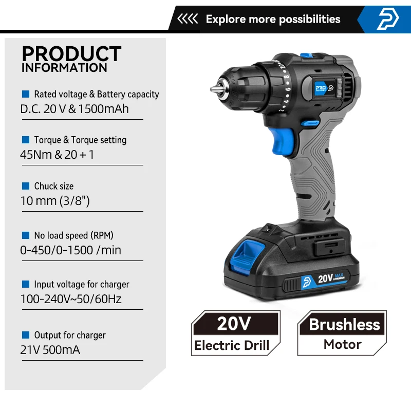 Бесщеточная электрическая дрель 20 В, 45 нм, аккумуляторная дрель, ...