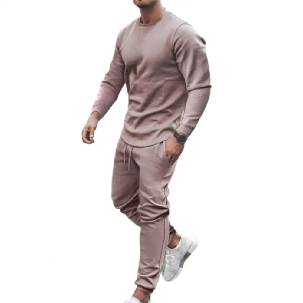 Спортивный костюм мужской однотонный, Приталенный топ со средней талией и круглым вырезом, повседневные брюки, комплект для бега, весна