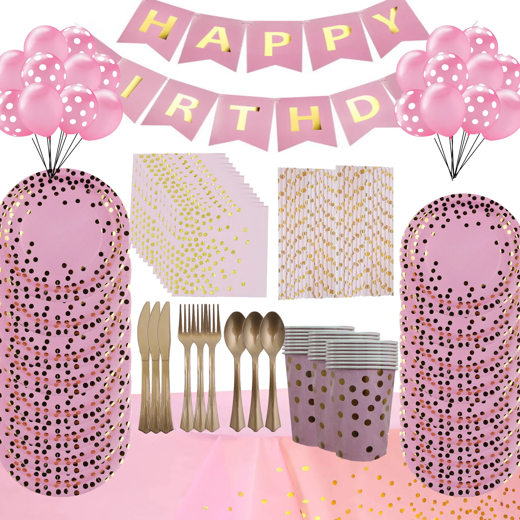 Детская розовая Золотая посуда в горошек для вечеринки или дня рожд...