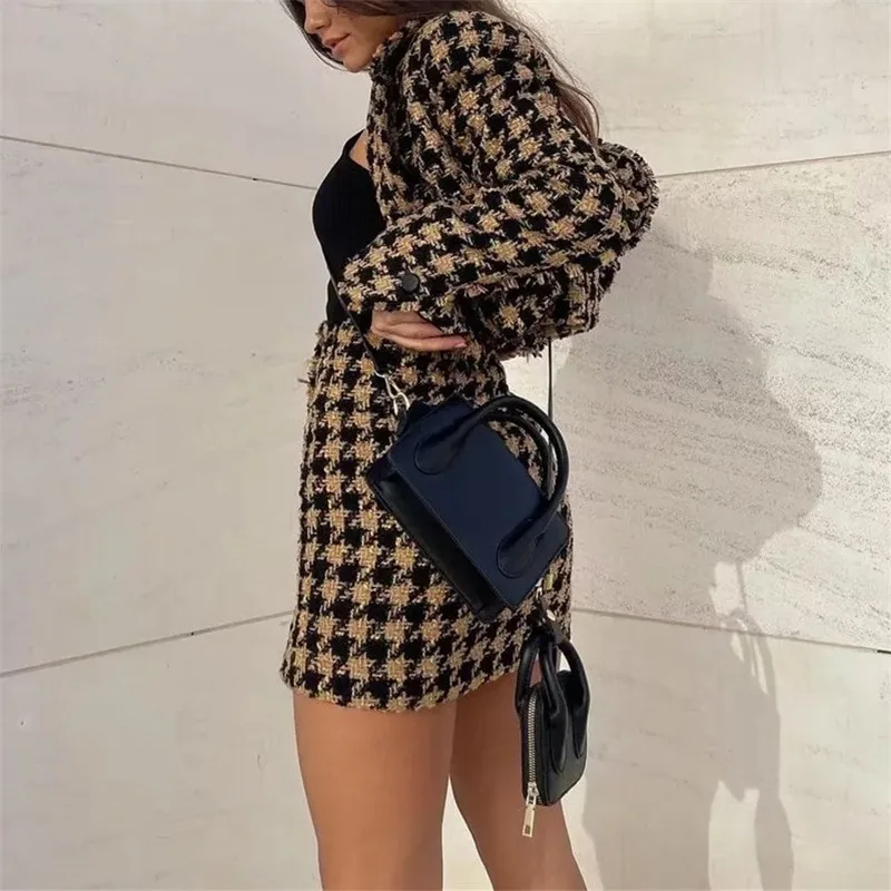 Женский клетчатый Блейзер, укороченный пиджак с длинным рукавом, твидовый жакет в клетку, повседневная куртка на пуговицах, TRAF, 2021