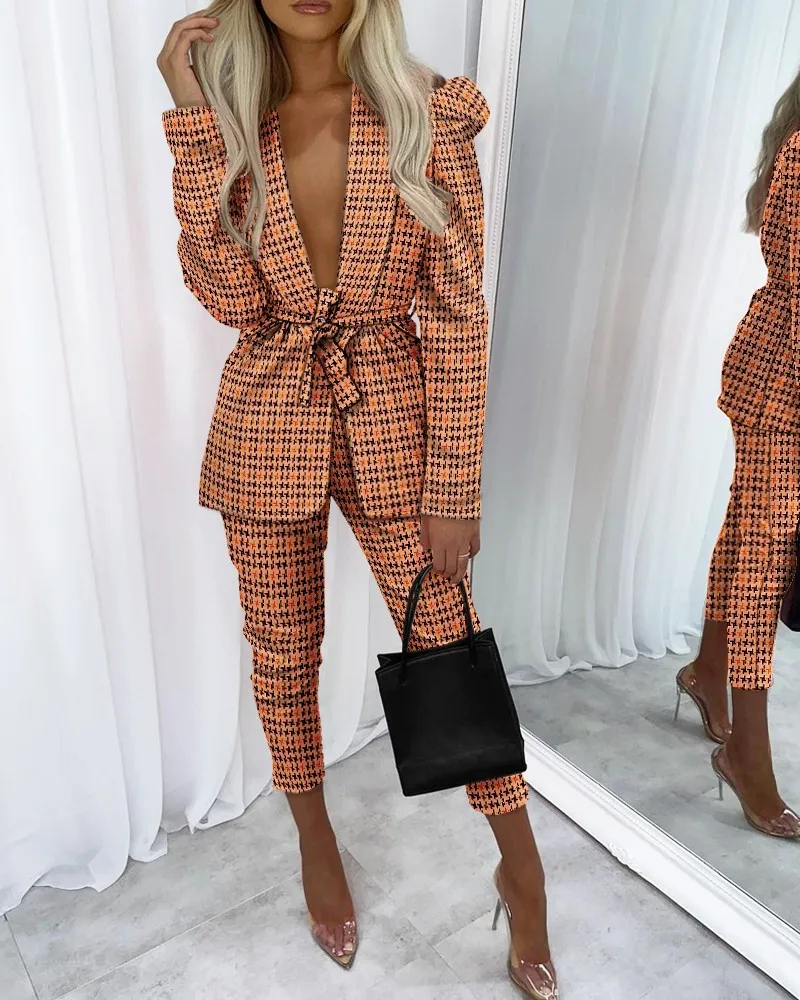 Женский офисный комплект из двух предметов, модный элегантный костюм из двух предметов с рисунком гусиные лапки и буффами на рукавах, пальто и брюки, осень 2021