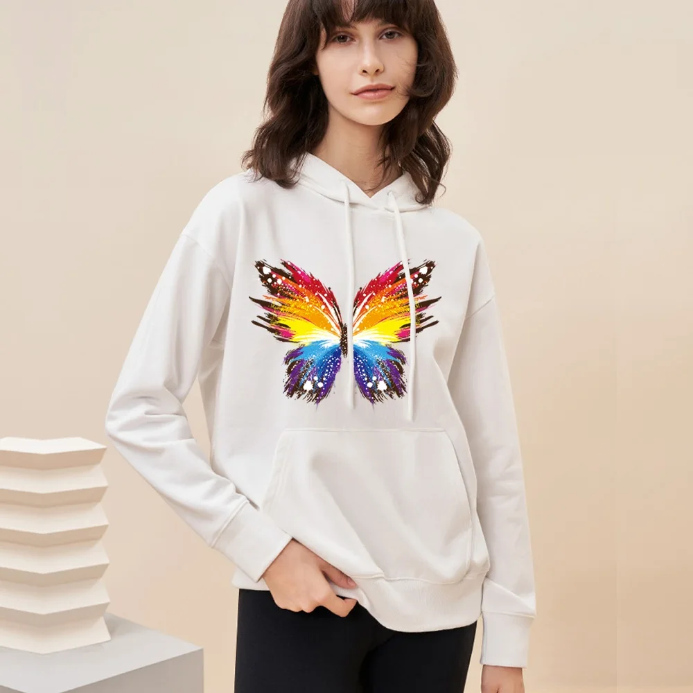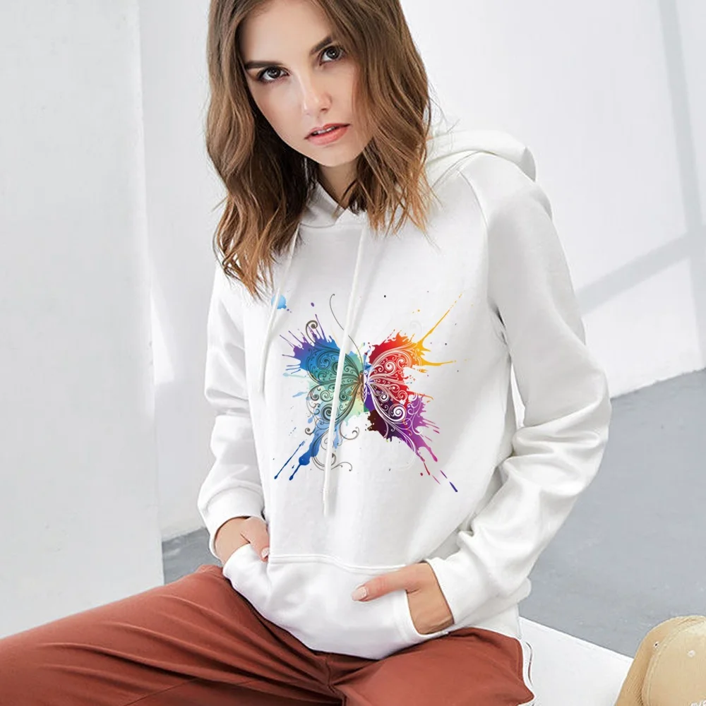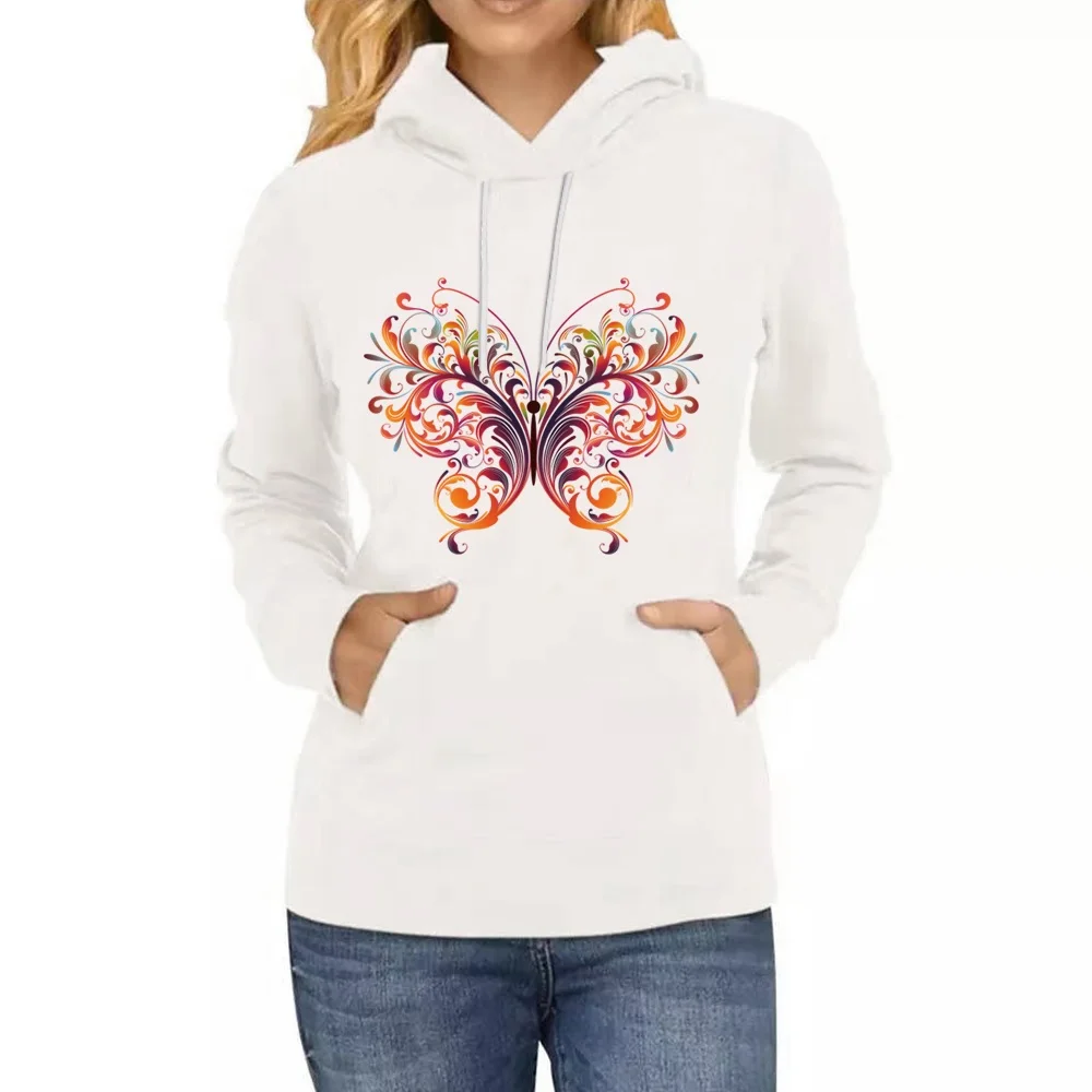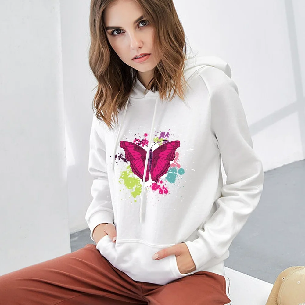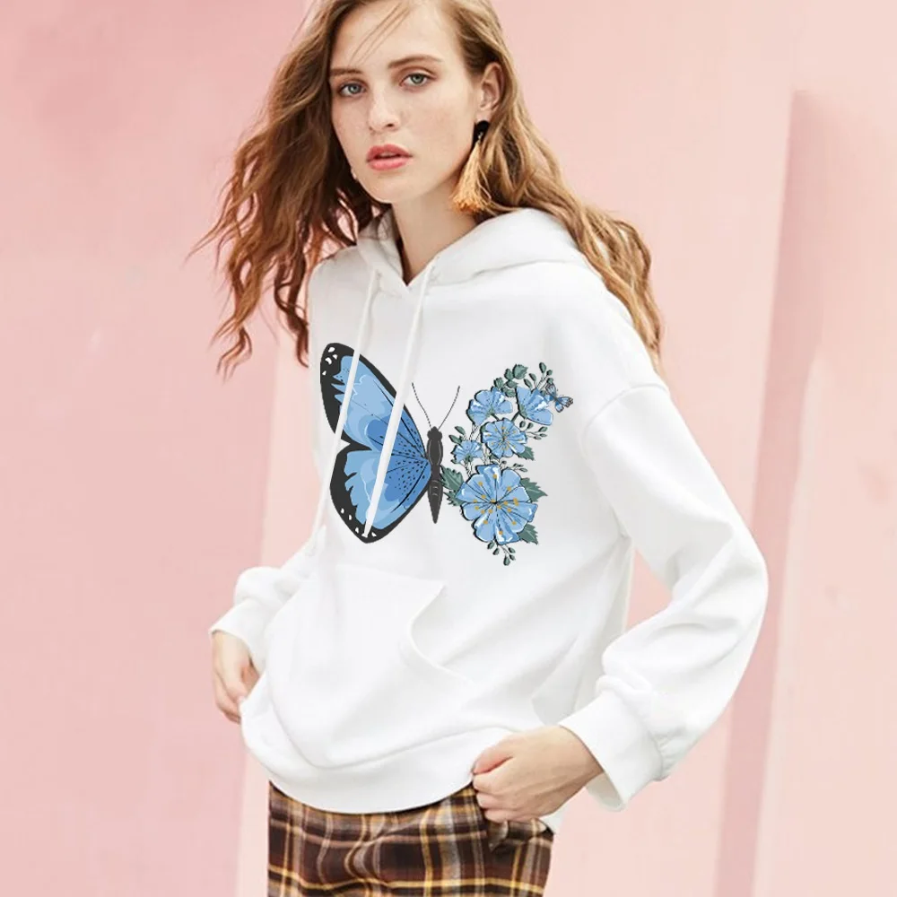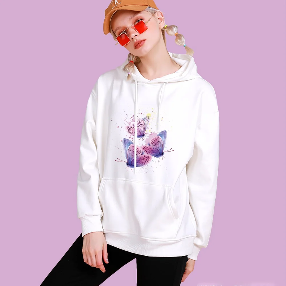 Белая толстовка с принтом бабочек, Женский Топ с длинным рукавом, осенняя толстовка с круглым вырезом, повседневные женские свободные модные толстовки, пуловер