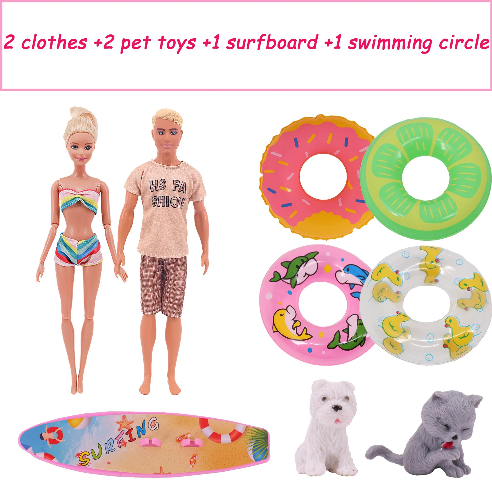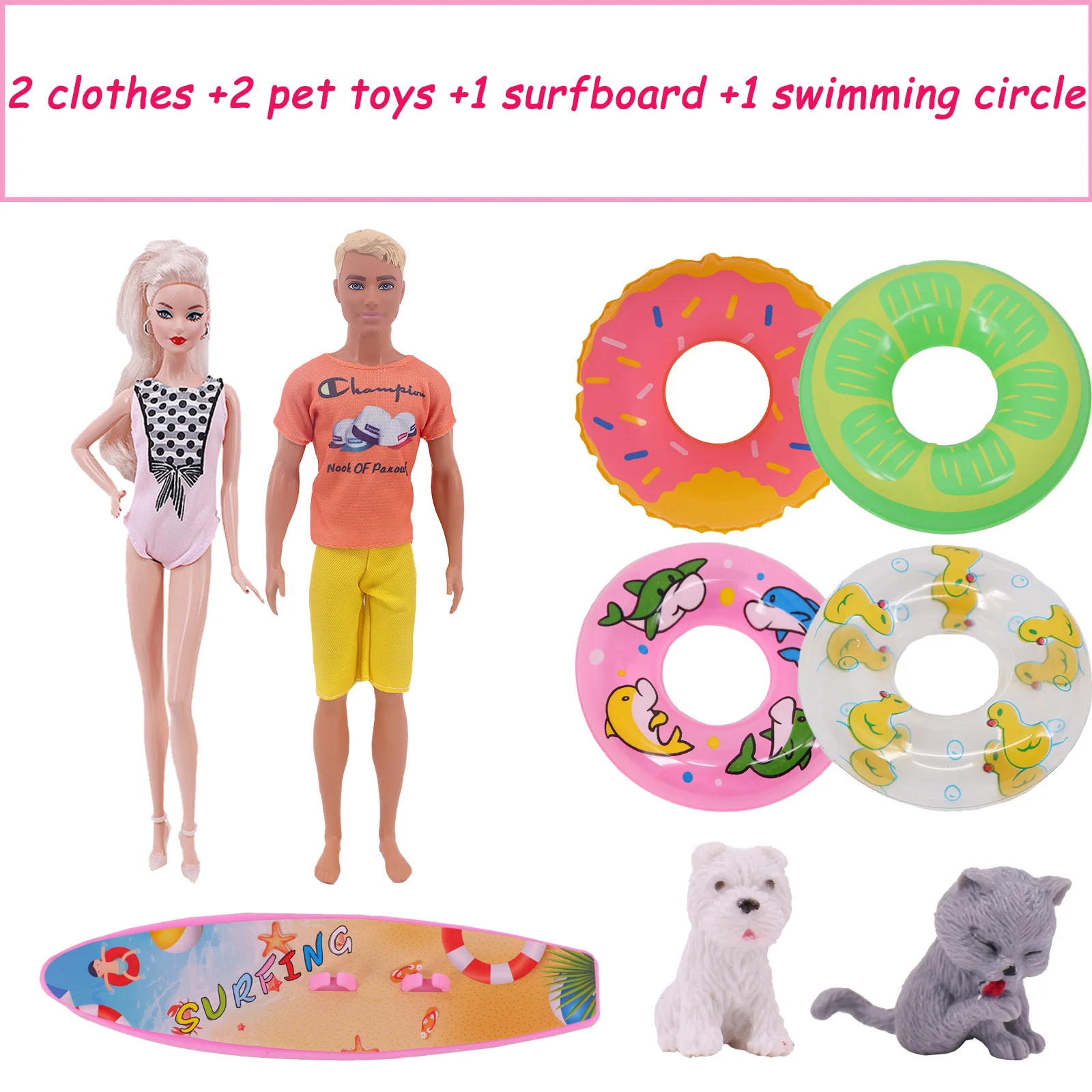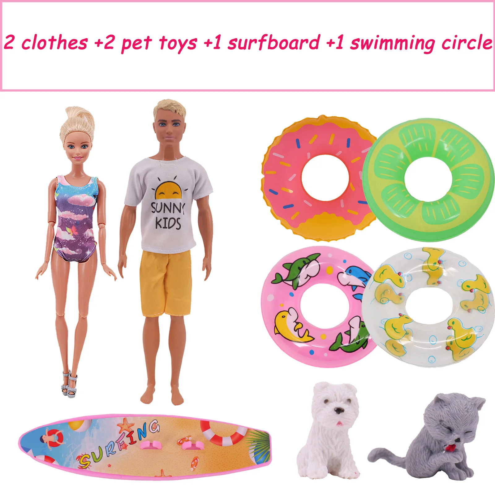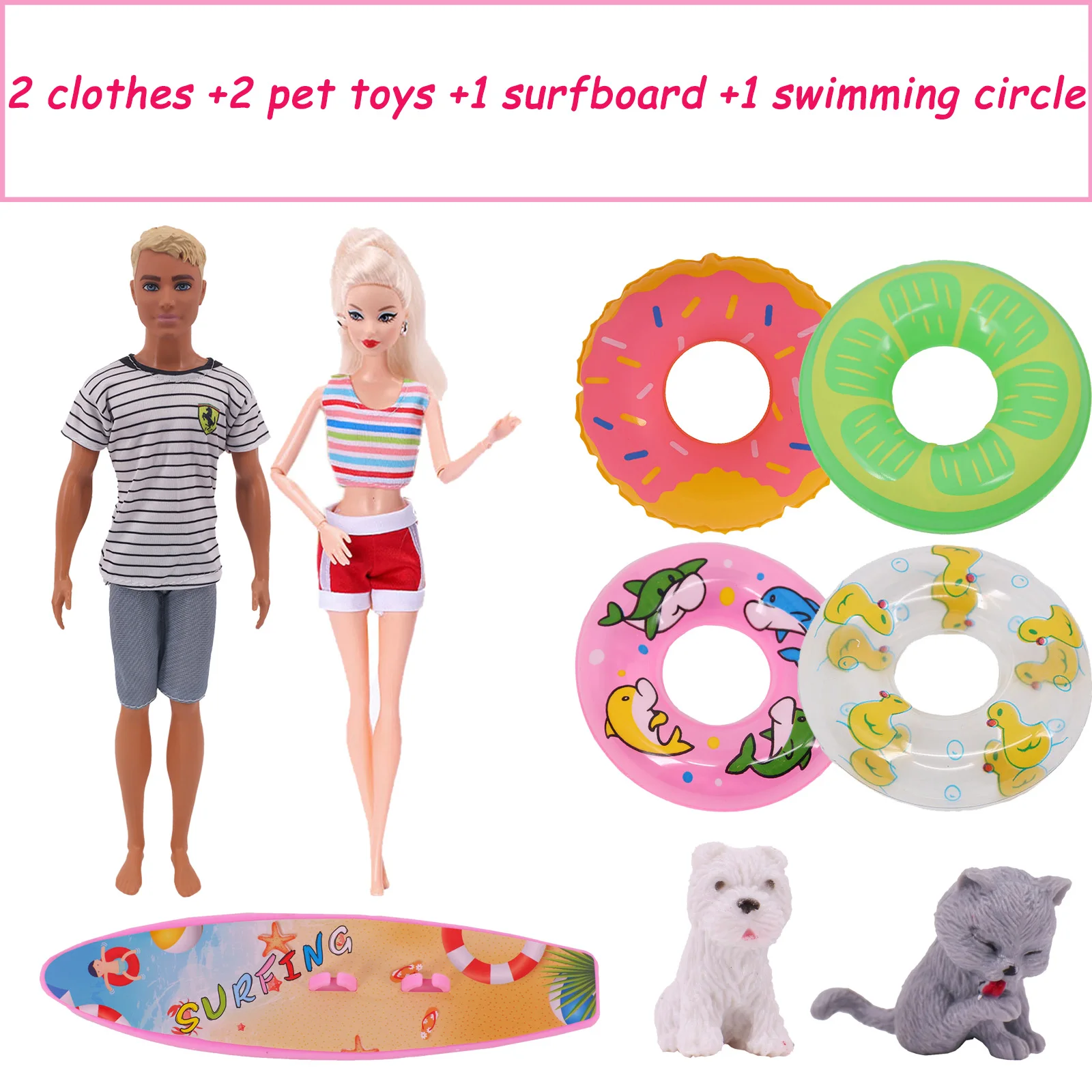 6 шт. Барби Кен Кукла Одежда Аксессуары 2 одежды + 2 игрушки для домашних животных + 1 доска для серфинга + 1 круг для плавания летняя одежда повседневная одежда детская игрушка