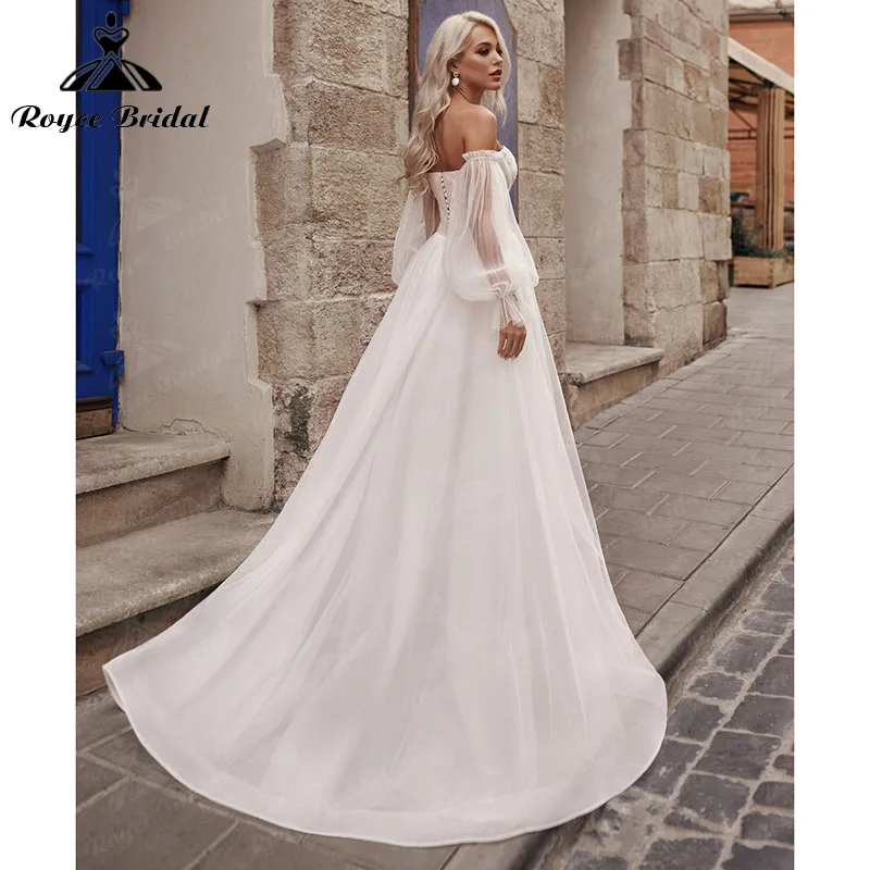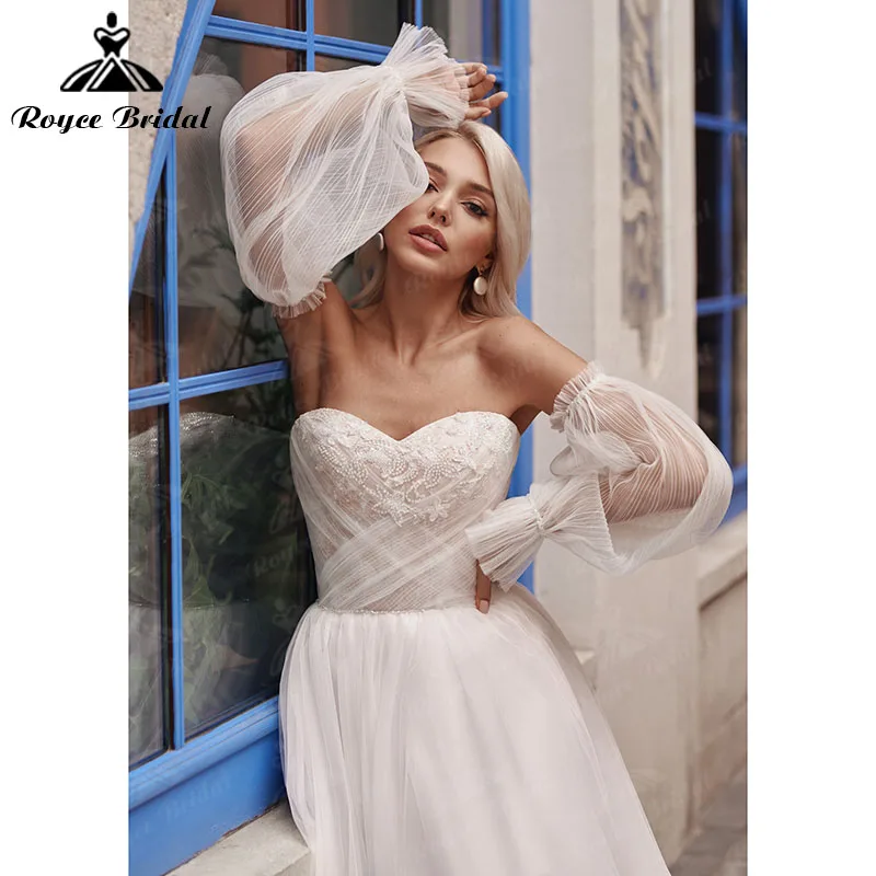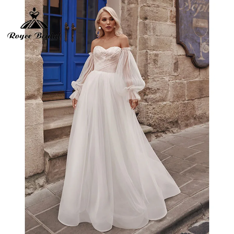 2022 Элегантное свадебное платье Бохо милое кружевное свадебное платье со съемным пышным рукавом с открытой спиной Иллюзия А-силуэт Roycebridal
