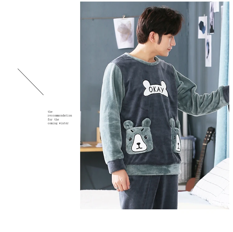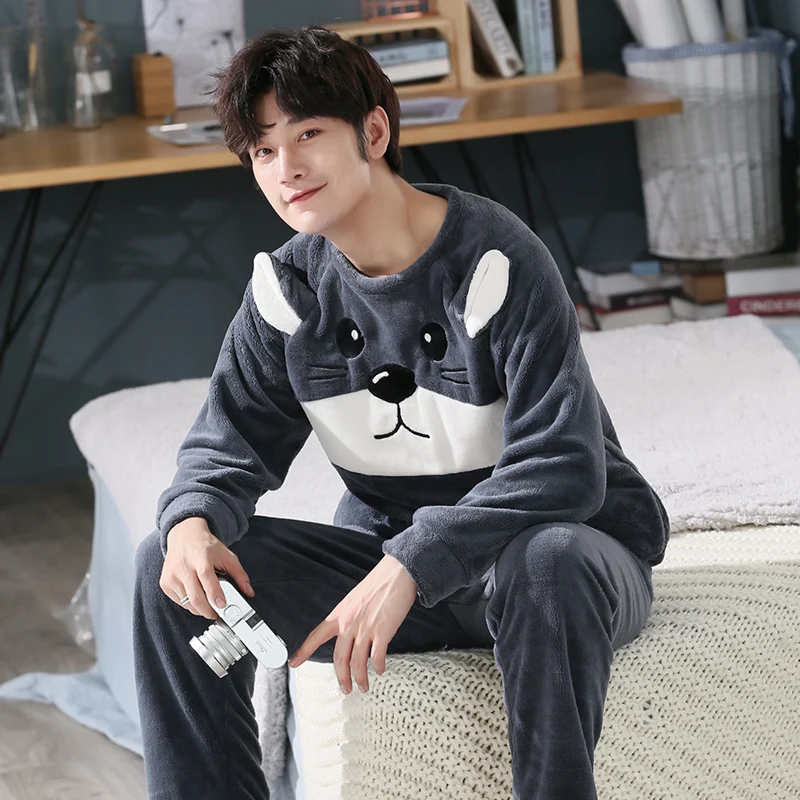 Размера плюс Kawaii мультфильм Животные ночная рубашка с длинным рукавом Зимние теплые фланелевые пижамные комплекты одежда для сна длинные брюки Мужской пижамный комплект