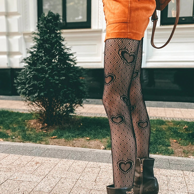 Женские ажурные колготки в горошек с черным сердцем, готические, панковские, ажурные, сетчатые Прозрачные Колготки с рисунком, черные тату, рыболовные сети