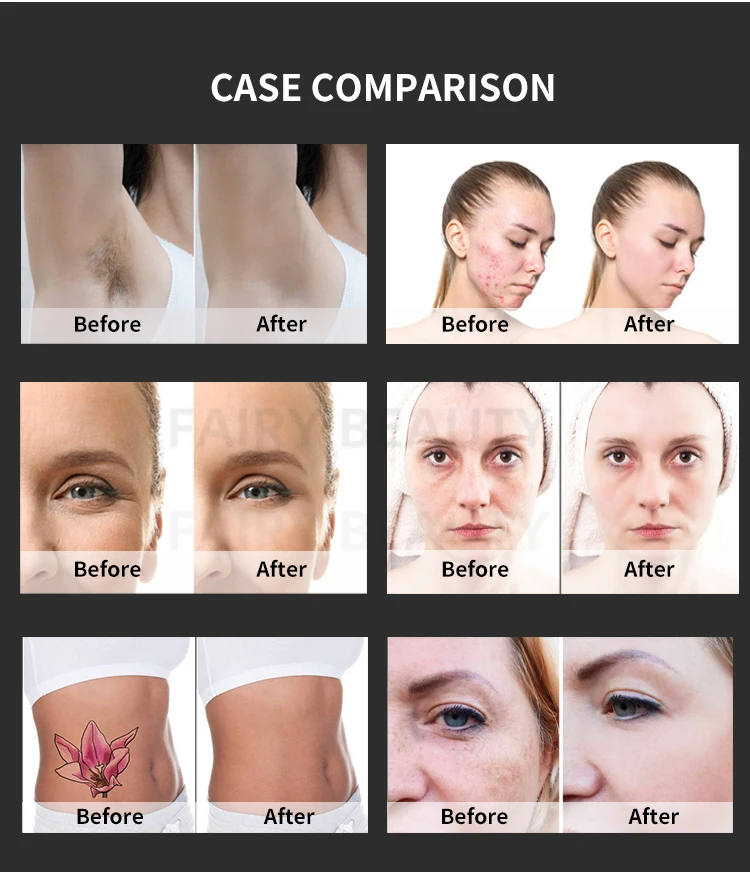 1. Удаление морщин: удаление реальных морщин, псевдо-морщин, подтяжка лица.2. Омоложение всего тела.3. Удаляет веснушки, хлоазму, возрастные пигменты, солнечные ожоги, хорионалет и т. Д.4. Удаление пигмента: красное лицо и красные волосы, акне, нос бутылки и т. д.5. Воском: подмышка, линия волос, борода, усы, губы, волосы на теле, бикини или любые другие нежелательные волосы.
