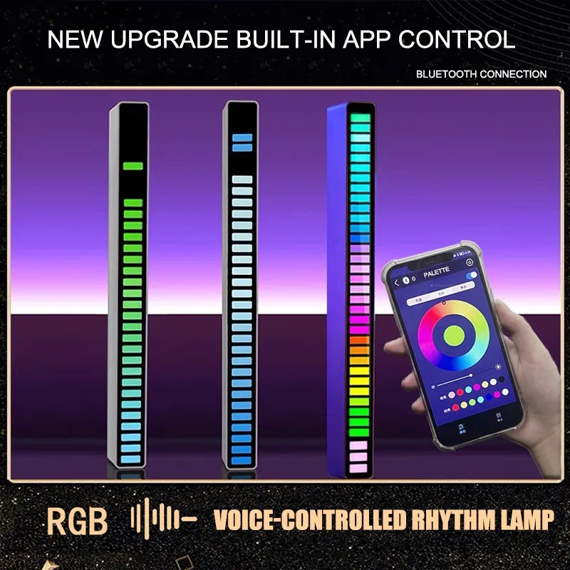 Цветной светильник со звуковым управлением, USBперезаряжаемая батарея, управление через приложение, 32 светодиодный, голосовой пикап, активированный ритм, световая лента, автомобильный компьютер