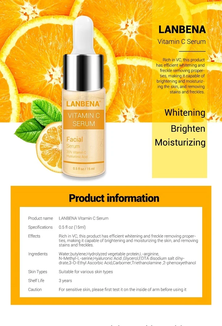Название продукта: сыворотка витамина C LANBENAХарактеристики: 0,5 унций (15 мл)Эффекты: богатый vC, этот продукт имеет эффективное отбеливание и удаление веснушек, что делает его способным осветлить и увлажнить кожу, удалять пятна и веснушки.