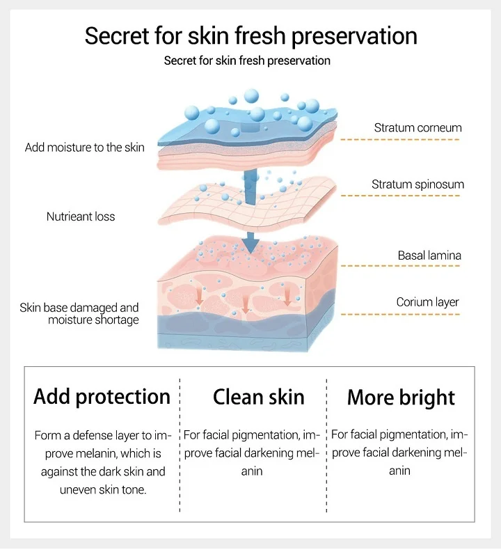 * Добавить защитуФорма защитного слоя для улучшения меланина, который против темной кожи и неровного тона кожи* Чистая кожаЛицевая пигментация, улучшает затемнение лица меланин* Более яркийЛицевая пигментация, улучшает затемнение лица меланин