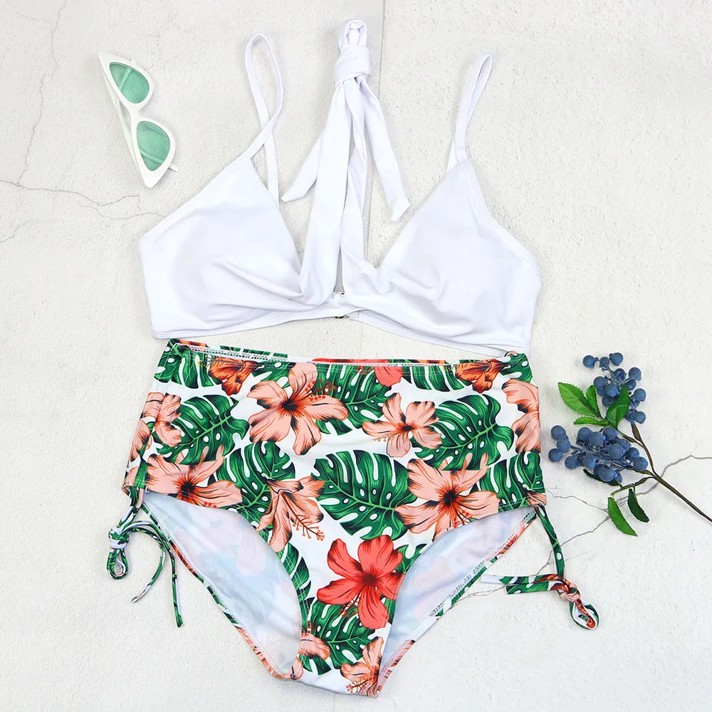 Летний комплект бикини из 3 предметов, женский купальник с цветочным принтом и листьями, бандажный бюстгальтер пуш-ап, трусы с высокой талией, купальник Cargidan