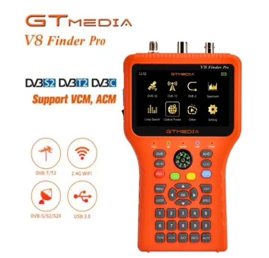 GTMEDIA V8 Finder2-это DVB-S/S2 и MPEG-2/4 H.264(8 бит) совместимый портативный спутниковый счетчик. Благодаря компактному размеру, легкому весу, интуитивно понятному интерфейсу пользователя, долгим часам работы батареи и богатым набором функций, счетчик предоставляет все функции, необходимые для установки и проверки цифрового спутникового ТВ-сервиса для жилых домов или многожилых единиц.