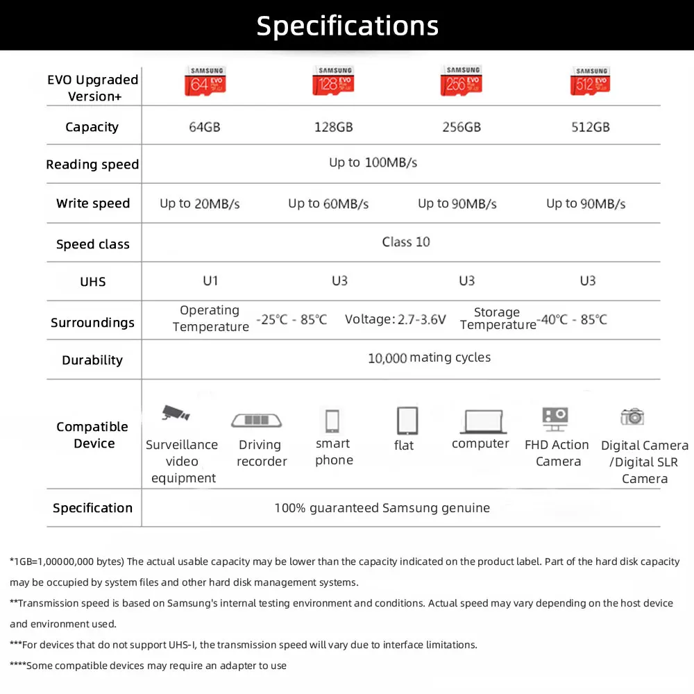 EVO Plus Capacity16G/32G/64G/128G/256G/512G(available capacity approximately 90%-93%)