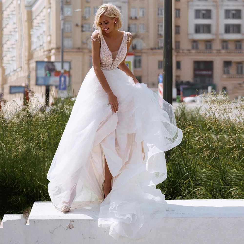 Элегантные свадебные платья, сексуальные, с открытой спиной, фатиновые длинные, цвета слоновой кости, а-силуэт, v-образный вырез, бисероплетение, без рукавов, свадебные платья, для женщин