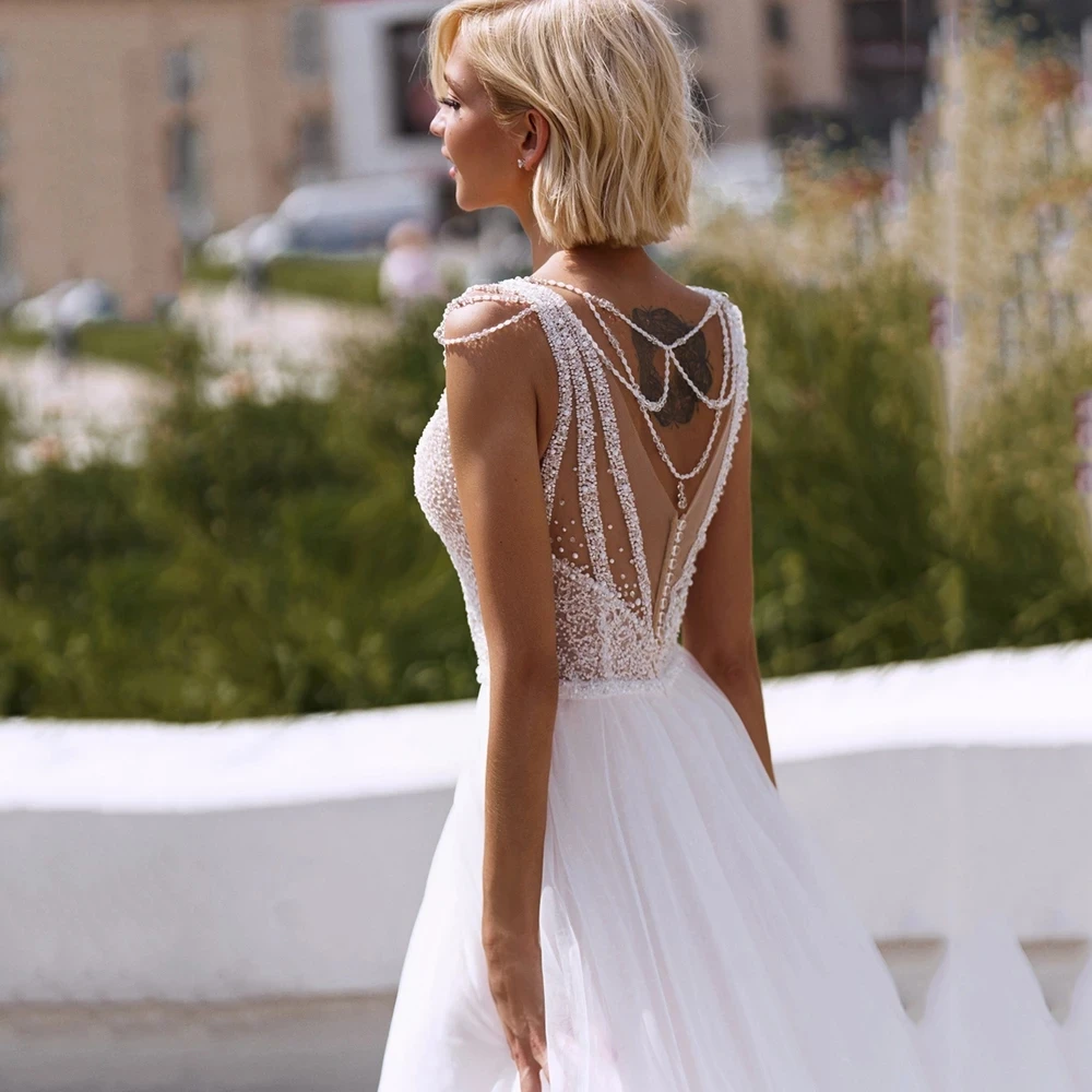 Элегантные свадебные платья HERBURNL, привлекательные тюлевые длинные платья-трапеции цвета слоновой кости с открытой спиной, V-образным вырезом и бисером, свадебные платья без рукавов для женщин