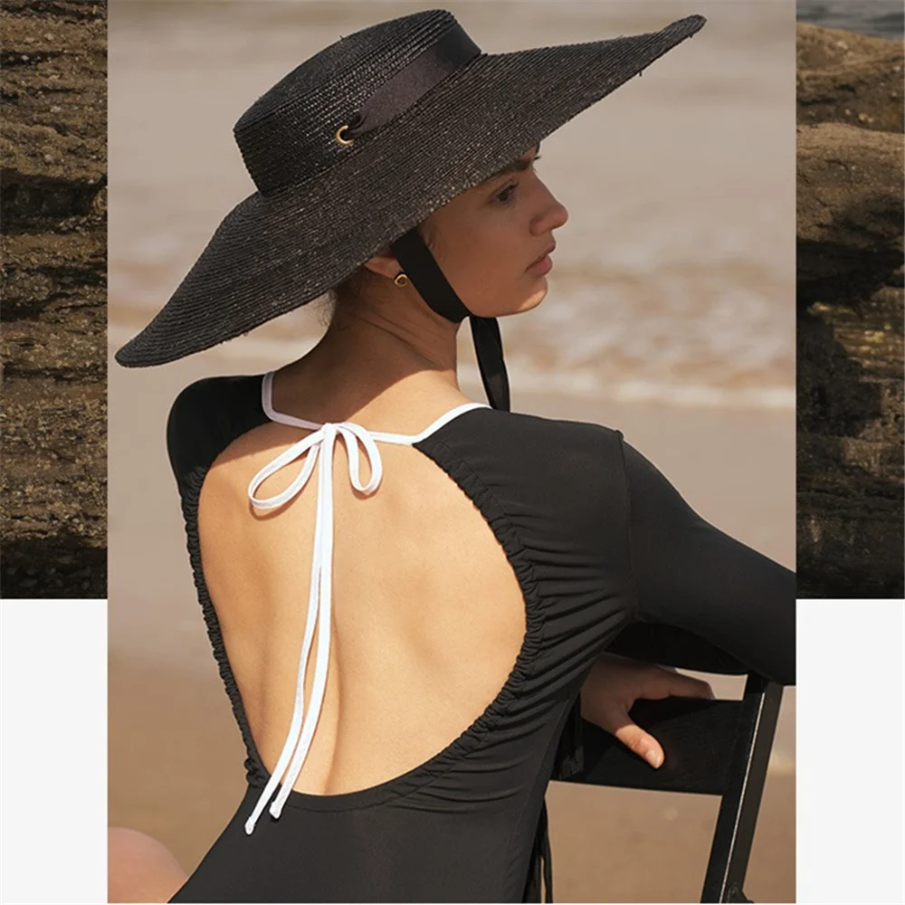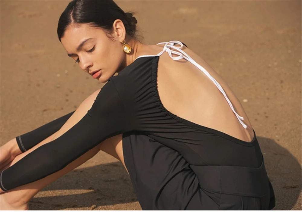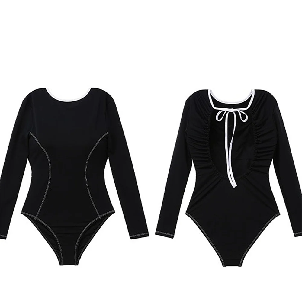 Женский слитный купальник с длинным рукавом, однотонный черный купальник с открытой спиной, одежда для плавания и серфинга на бретельках, сексуальная одежда для дайвинга