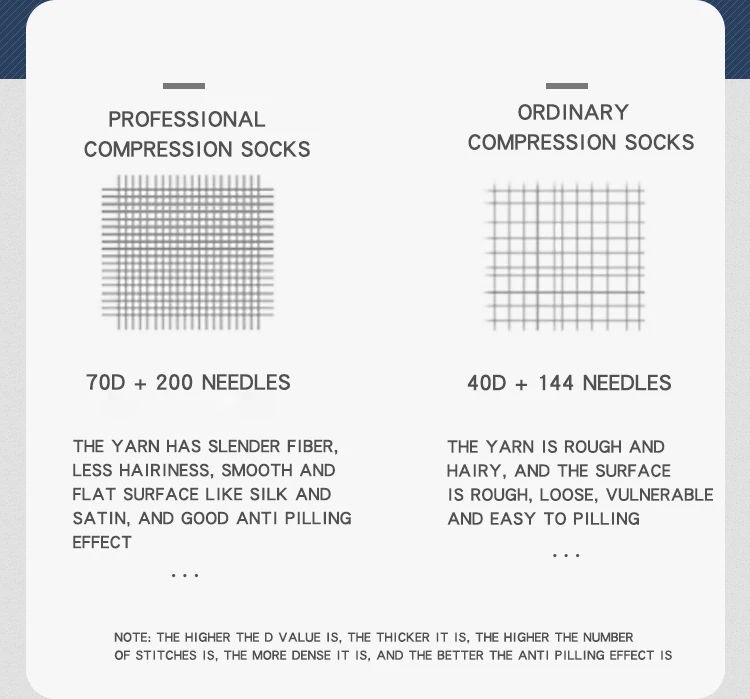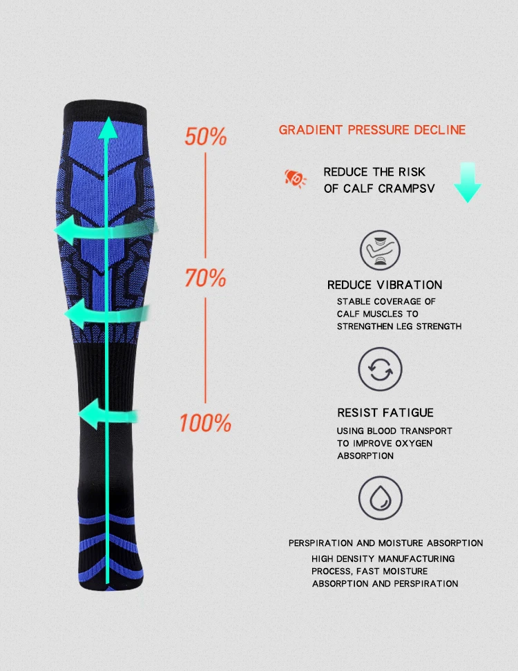 Какой уровень выбрать?Первый уровень (20-30 мм рт. Ст.): подходит для профилактики здоровья у людей. Например, учители, сотрудники ГИБДД, медсестры, доктора, косметологи, торговые гиды и т. д., и эти носки также подходят для ранних симптомов, таких как венозные сосуды с небольшой нижней конечностью, стоя слишком долго, ощущая болезненностьУровень 2 (30-40 мм рт. Ст.): для тех, кто имеет очевидные признаки в нижних конечностях и сопровождается дискомфортом ног (например, боль в конечностях, усталость, отеки и экземы, судороги, покалывание, пигментация, И т. Д.), флебит, беременность, после эксцизии вены, и синдром тромбоза глубоких вен.Уровень 3 (40-50 мм рт. Ст.): подходит для людей с высокими отеками, затемненной кожей и необратимыми лимфемами.Почему все больше и больше людей любят носить компрессионные носки сейчас?Независимо от того, являетесь ли вы спортсменом, который хочет преуспеть в игре, который сидит долгое время во время путешествий или на работе, или кто-то, кто борется с болью из-за хронического состояния, поддержка правильного кровотока на ноги имеет первостепенное значение. Наши компрессионные носки разработаны с новейшей технологией сжатия от свода до икры, Обеспечивает поддержку голени и мышц ног, помогает сохранить приток крови, чтобы повысить атлетические показатели и облегчить боль из-за ряда условий.Снижает риск травмОбеспечивает дополнительную компрессионную поддержку для стабилизации свода, лодыжки и мышц. Минимизирует колебания мышц и micro-tearing.Prevents спазмов и травм. Усиленная поддержка может предотвратить травмы из-за плохой силы мышц, особенно во второй половине марафона.Улучшает вашу производительностьДля спортсменов на выносливость ключевым механизмом является «икроночный мышечный насос»-с каждым шагом или педальным ударом, сжимающий и разжимающий телячьи мышцы сдавливает кровь обратно к сердцу. Наши компрессионные носки обеспечивают дополнительное сжатие, которое усиливает это действие накачки, ускоряя поток очень необходимого кислорода для работы мышц. Ускоряет кровообращение к сердцу и избавляет от метаболических отходов от мышц.Помогает быстрее восстановитьсяСтимулирует кровоток и улучшает доставку кислорода в ваши мышцы. Уменьшает выработку молочной кислоты, мышечную болезненность и чувство тяжеловесности в ногах и ногах. Более быстрое восстановление от «задержки начала мышечной болезненности».Помогает предотвратить или снять отекиПомогает контролировать отек через улучшенную циркуляцию и ускоряет удаление клеточных отходов. Уменьшает отеки и усталость от длительного сидения или стоя. Идеально подходит для беременных женщин и тех, кто сидит или стоит в течение длительного периода во время путешествий или на работе.Помогает облегчить боль в подошвенном фасциитеРазработан с компрессией, чтобы помочь в управлении болью и облегчении от подошвенного фасцита, пятки шпоры и боли в суставах. Помогает при стоянии и ходьбе. Сжатие связок уменьшит воспаление, ускоряя процесс заживления.Которые могут извлечь выгоду из компрессионных носков:1. Беременная женщина2. Спортсмены и активные люди занимаются спортом, бегом, пешим туризмом, велоспортом, футболом и т. д.3. Частые путешественников или тех, кто летает на длинном самолете4, рабочие места, которые требуют от вас быть на ногах много: медсестры, учи