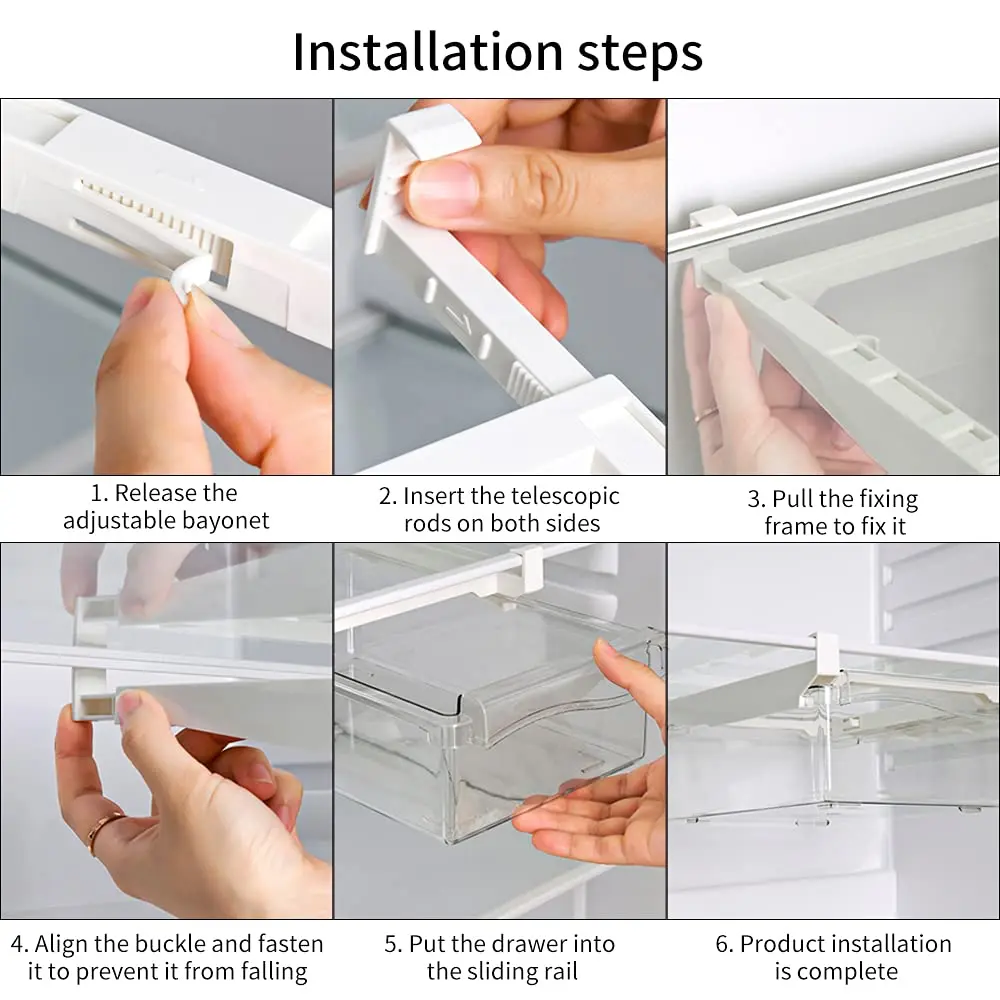 Шаги установки:1. Отпустите Регулируемый байонет.2. Вставьте Телескопические стержни с обеих сторон.3. Выровняйте стеклянную пластину холодильника.4. Потяните фиксирующую раму, чтобы зафиксировать ее.5. Выровняйте пряжку и закрепите.6. Поместите ящик в скользящий рельс.6. Установка завершается7. Используйте эффект дисплея.