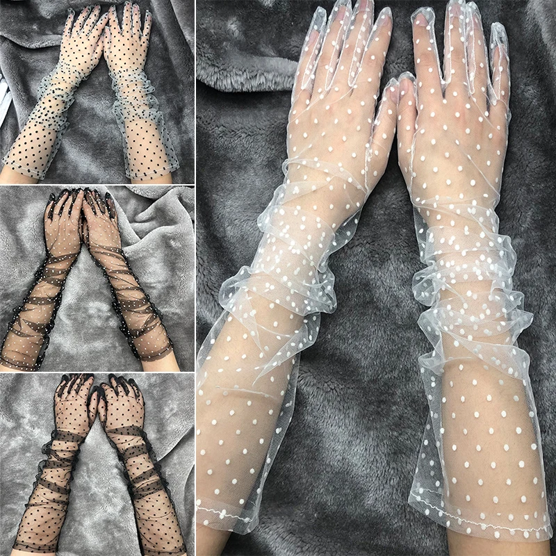 Модные кружевные длинные перчатки в горошек, женские элегантные тянущиеся тюлевые сетчатые полупрозрачные женские варежки с закрытыми пальцами, свадебные черные перчатки для невесты