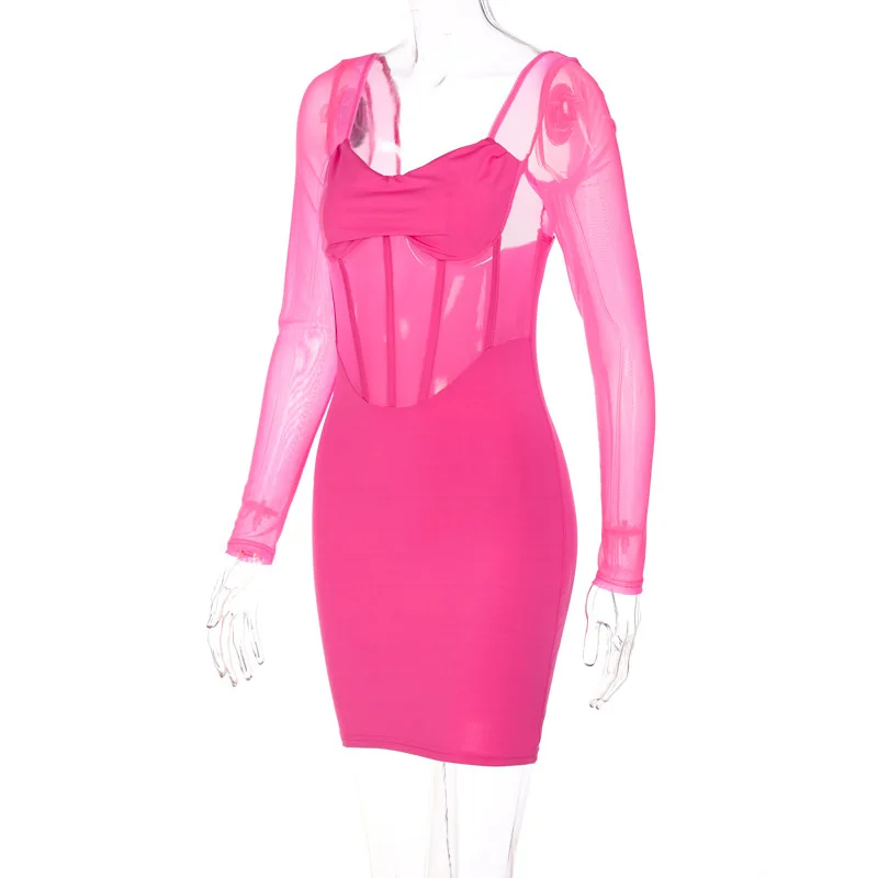 Женское Сетчатое мини-платье с открытой спиной, квадратным вырезом и длинным рукавом