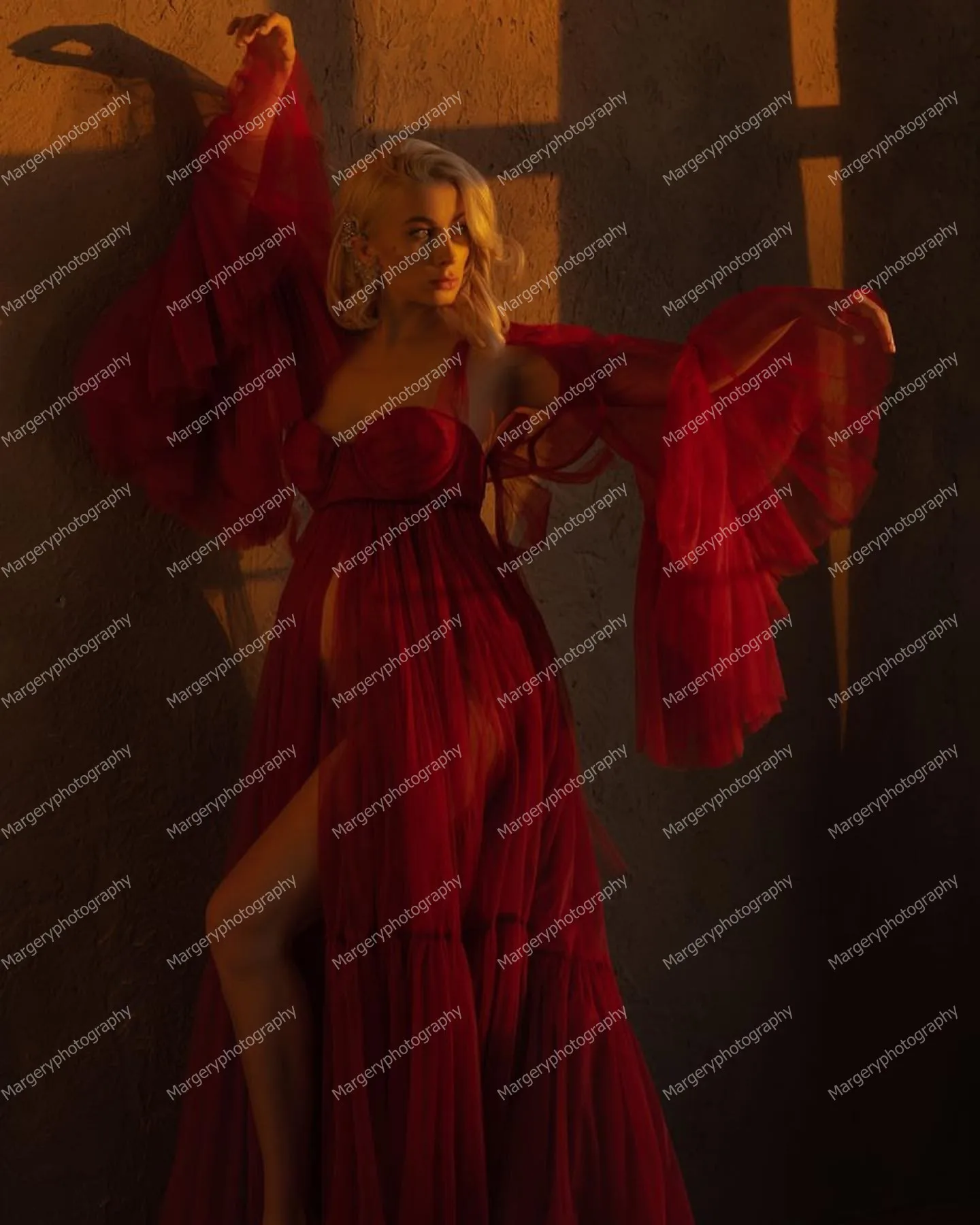 Роскошное Тюлевое длинное платье для беременных из двух предметов бордового цвета с мини-юбкой сексуальные сетчатые платья с разрезом спереди для фотосъемки на заказ