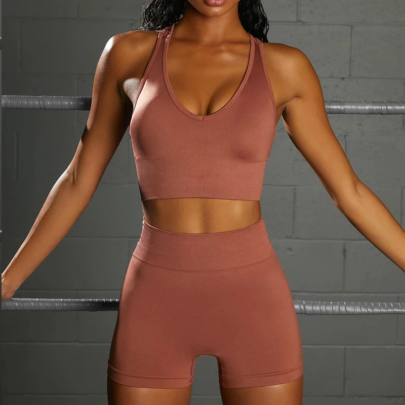 Комплект шорт для йоги, спортивный костюм для женщин, спортивный костюм из 2 предметов, укороченный топ с глубоким v-образным вырезом, спортивные шорты, одежда для тренировок, спортивная одежда