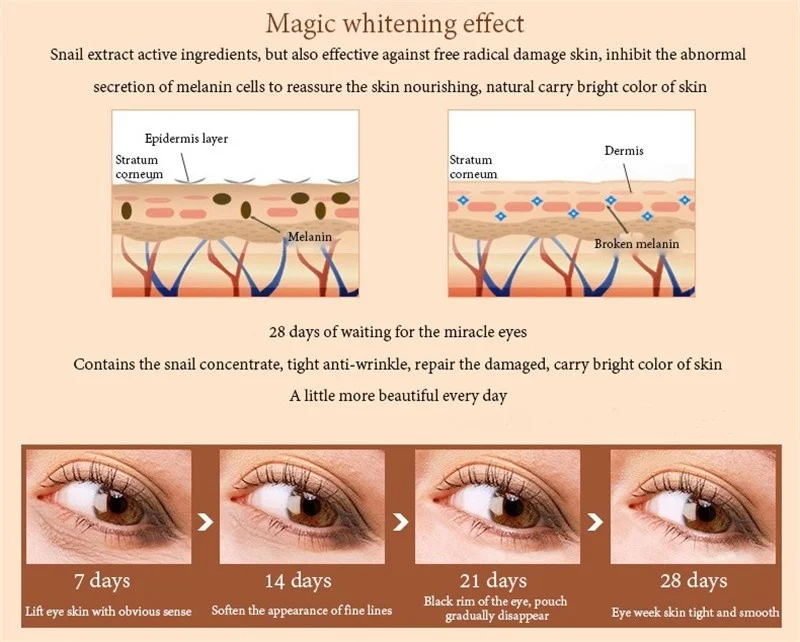 -- Экстракт улитки активных ингредиентов, но также эффективно против свободных радикальных повреждений кожи, подавляет аномальныеСекреция клеток меланина для обеспечения питательной кожи, естественный яркий цвет кожиСлой эпидермиса/кожный слой/Сердечник/меланин/сломанный меланин-- 28 дней ожидания чудо-глазСодержит улиточный концентрат, плотное против морщин, восстанавливает поврежденные, переносит яркий цвет кожиНемного красивее каждый день