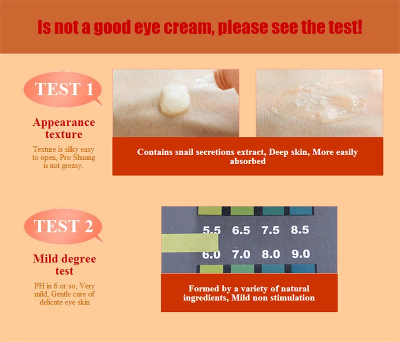 TEST1Текстура внешнего видаТекстура шелковистая, легко открывается, Pro Shuang не жирная.Содержит экстракт секреций улитки, глубину кожи, легчеТест 2Тест на слабую степеньPH n 6 или около того, оченьФормируется из различных природныхМягкий Бережный уход за нежной кожей глазИспользование после того, как кожа значительно усиливает воду, увлажняющий эффект очень хорош!Текстура очень светильник, кожа сразу впитываетПосле использования все еще увлажняет, поглощение очень хорошее, протрите масляной поглощающей бумагой без остатка