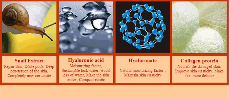 ** Экстракт улиткиВосстанавливает кожу. Разбавить pock, глубокое проникновение кожи, совершенно новый coruscate** Гиалуроновая кислотаУвлажняющий фактор, устойчивая Блокировка воды, предотвращает потерю воды, делает кожу нежной, компактной эластичной** ГиалуронатЕстественный увлажняющий фактор, сохраняет эластичность кожи** Коллагеновый белокПитает поврежденную кожу, улучшает эластичность кожи, делает кожу более нежной