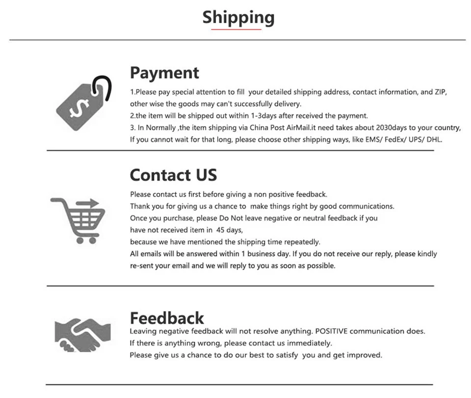 1. Размеры показаны с конкретными измерениями в подробных спецификациях. Пожалуйста, проверьте спецификации перед размещением заказа. Обычно допустимые различия в размере примерно 1-3 см в измерениях, пожалуйста, не оставляйте нам плохой отзыв.