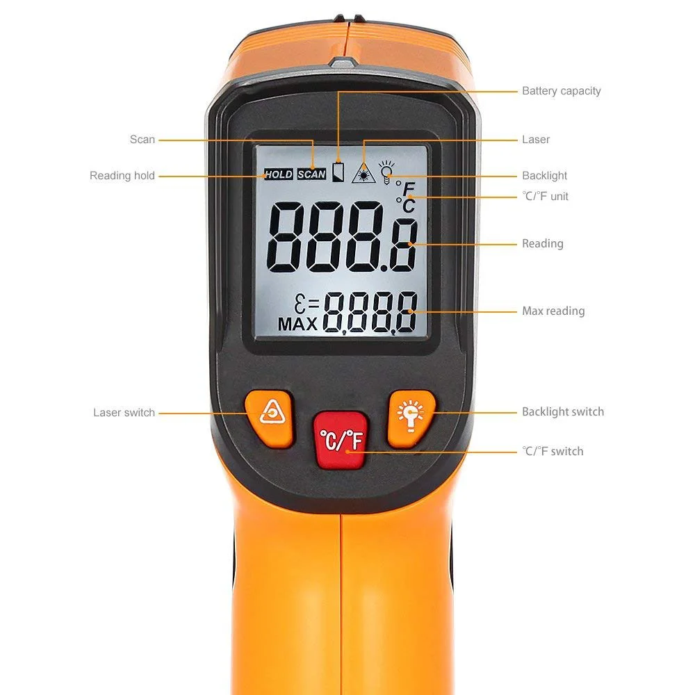 Особенности:• Лазерная указка для точного прицеливания• Простое управление одной рукой• ЖК-дисплей со спинкой светильник• Переключатель включения/выключения лазера• Индикация низкого заряда батареи• Светодиодный светильник для работы при плохом освещении• Преобразование температурного блока C /F• Автоматическое выключение в течение 7 секунд без каких-либо действий• Удержание дисплея, функция сканированияХарактеристики:• Диапазон измерения: -50 °C ~ 380 °C ( -58 °F ~ 716 °F)• Точность: -50 °C ~ 0 °C (± 3 °C), 0 °C ~ 716 °C (± 1.5%)• Повторяемость: 1 °C или 1% чтения• Разрешение: 0,1 °C или 0,1 °F• Время отклика: 500 мс, 95% ответ• Излучение: 0,95 Предустановленный• Расстояние до точки рациона: 12:1• Спектральная Характеристика: 8 ~ 14 мкм• Температура хранения: -20 °C ~ 60 °C (-4 °F ~ 140 °F)• Рабочая температура: 0 °C ~ 40 °C (32 °F ~ 104 °F)• Рабочая влажность: 10-95% относительной влажности без конденсации, до 30 °C (86 °F)• 2 х ААА 1,5 V батарея (не входит в комплект)
