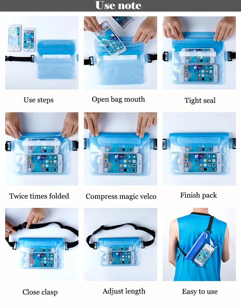 100% водонепроницаемость: Защитите свой телефон или камеру от воды, пыли, песка, дождевых капель. Название: водонепроницаемая сумка для отдыха и путешествий Высококачественный материал: Чехол Изготовлен из прочного ПВХ материала Размер: 210 мм × 170 мм Применимо: рыбалка пляж плавание дайвинг рафтинг вверх по течению реки эксклюзивный и другие связанные Водные виды деятельности Основные характеристики: многослойный защитный канал, водонепроницаемый, прочный ремень, застежка-липучка, простой, удобный, универсальный, большой емкости, легкий и удобный