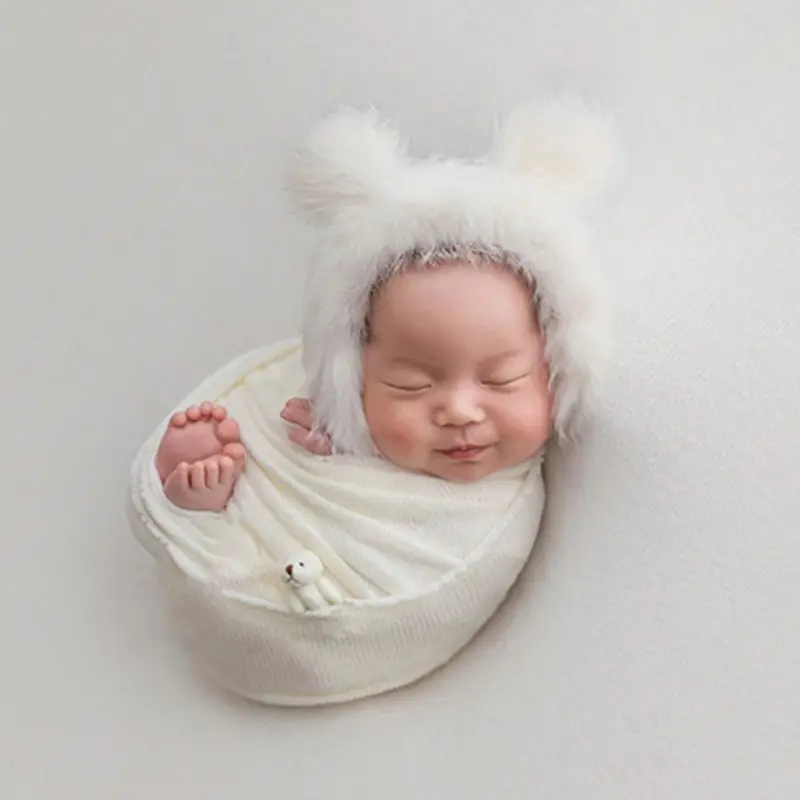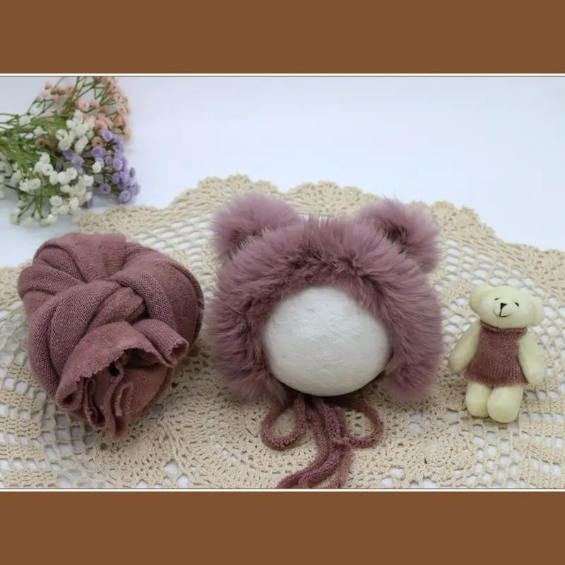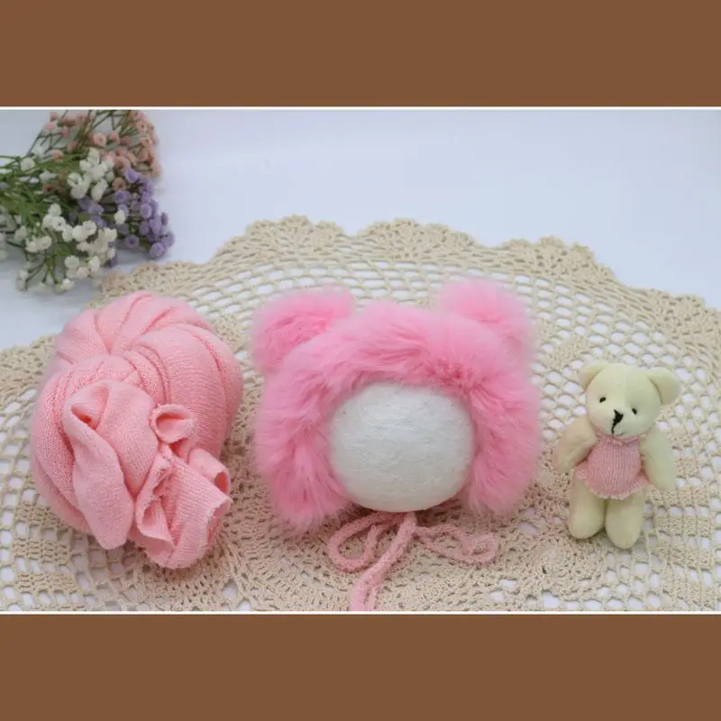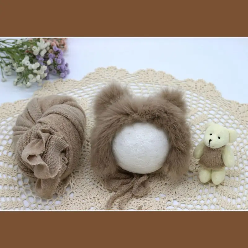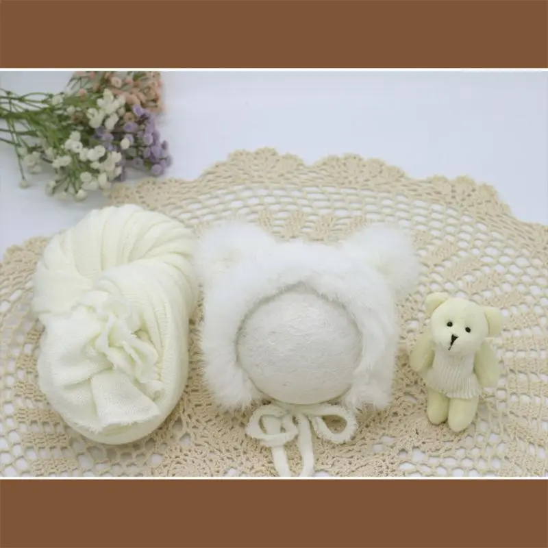 3 шт.компл., реквизит для фотосъемки новорожденных, пушистая стрейчевая вязаная шапка с милой шапкой из кроличьего меха, плюшевый мишка, игрушка, детское одеяло, костюм