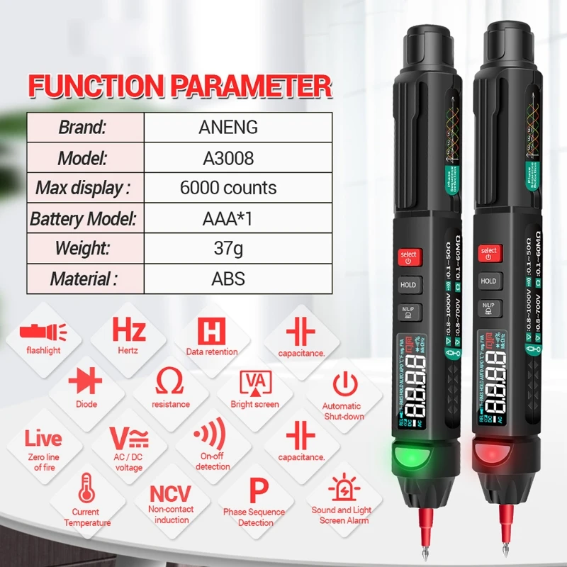 Бесконтактный мини-мультиметр ANENG A3008, цифровой мультиметр, 6000 отсчетов