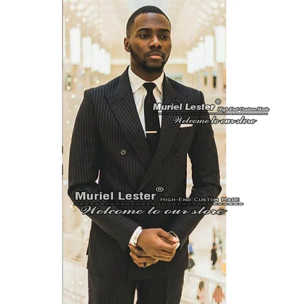 Мужской деловой костюм в полоску, темно-синий двубортный пиджак и брюки, костюм из двух предметов на заказ для весны и осени