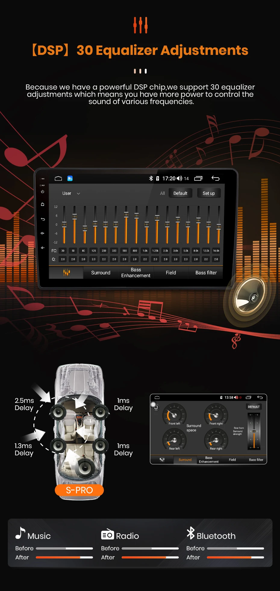 Благодаря встроенному усилению 4*45 Вт музыка звучит очень четко даже при высоких объемах.Вы можете настроить звук для ваших личных предпочтений, с 9 графический эквалайзер: поп, рок, джаз, Классическая, без каблука, пользователя, голоса и т. д.Несколько вариантов настройки позволяют вам наслаждаться звуком лучше.