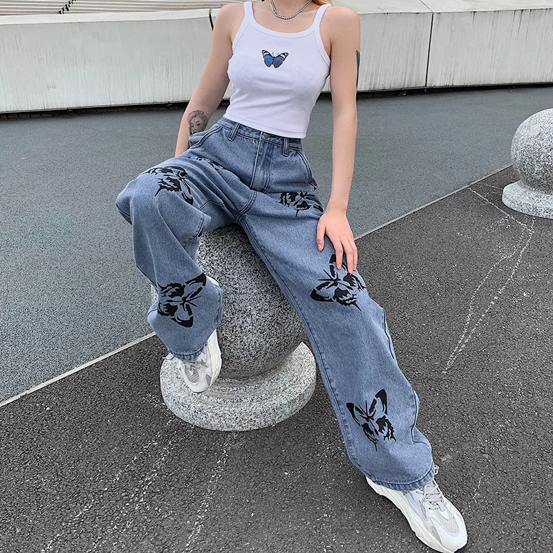 Джинсы женские, широкие, с высокой талией, с принтом бабочек
