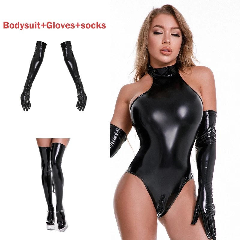 Сексуальное боди из искусственной кожи, боди, сексуальное женское нижнее белье Тедди, женское эротическое боди с перчатками и носками, сексуальные костюмы хозяйки